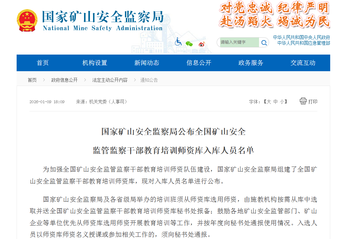 为加强全国矿山安全监管监察干部教育培训师资队伍建设,提升干部教育培训质量水平,国家矿山安全监察局研究决定,分级分类建设全国矿山安全监管监察干部教育培训师资库。国家矿山安监局专门成立师资库秘书处,在全国范围内遴选优秀师资,设置国家局师资和省级局师资两个级别,涵盖矿山灾害防治、应急救援、科技装备、智能化建设等多个专业领域。近日,国家矿山安全监察局公布全国矿山安全监管监察干部教育培训师资库入库人员名...