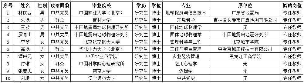 根据《事业单位公开招聘人员暂行规定》(人事部第6号令)、《防灾科技学院公开招聘人员暂行办法》(防科发人〔2018〕119 号)经考核,拟聘用林庆西等10人为防灾科技学院工作人员,现予公示。如对拟聘人员有异议,请于公示期内以电话、来访或书面形式向防灾科技学院人事处(010-61596031)或纪检室(010-61596110)反映。以书面形式反映应署真实姓名。公示期2020年6月24日至2020年6月30日。