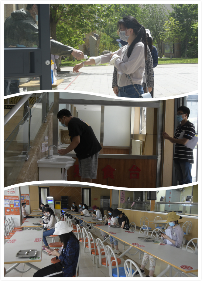 在餐厅就餐场景演练中,学生间隔1.5米,经过洗手消毒,按照路线指引,排队进入食堂内就餐,并于就餐完毕后及时有序离开。