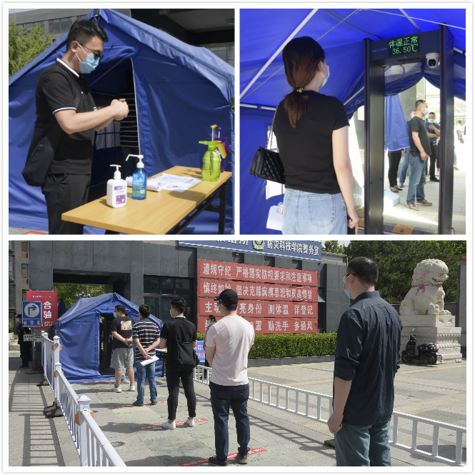 在学生进校场景演练中,安全保卫组组织引导由教职工志愿者饰演的学生佩戴口罩,间隔1.5米排队,经过学生洗手消毒、体温检测、出示行程码和健康码、刷脸核验身份,秩序井然的进入校园。