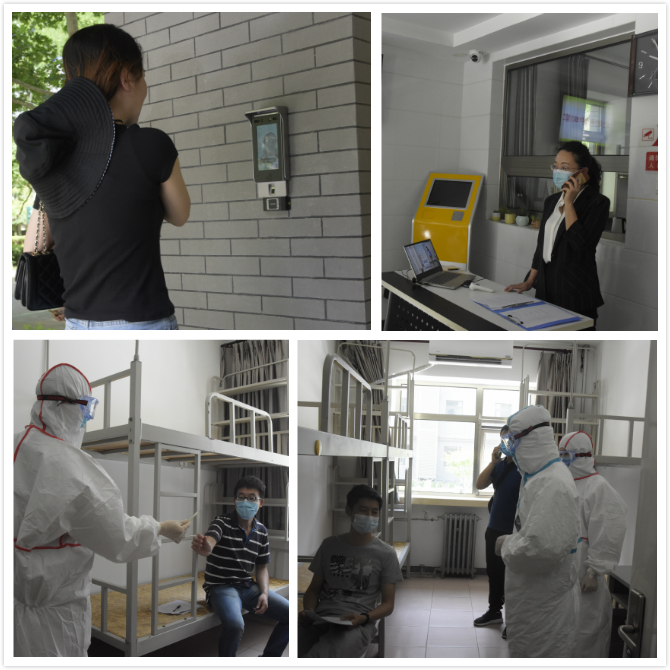 在处置宿舍内出现发热反应的学生场景演练中,学生通过热成像体温检测门,回到各自宿舍,其中一名学生感到不适,自行测量体温38度异常,遂电话联系公寓管理员,公寓管理员第一时间联系学校医务人员,同宿舍同学及时打电话告知其辅导员。医务人员穿戴防护服赶到现场,将发热同学带到校内隔离场所,公寓管理员转移同宿舍同学至留观宿舍隔离,医务人员对留观宿舍人员检查评估,并根据实际情况,进行消毒及学生情绪安抚工作。医务人员对发热学生进行评估,在不排除新冠肺炎的情况下,迅速联系相关医院转移就诊,同时上报结果。