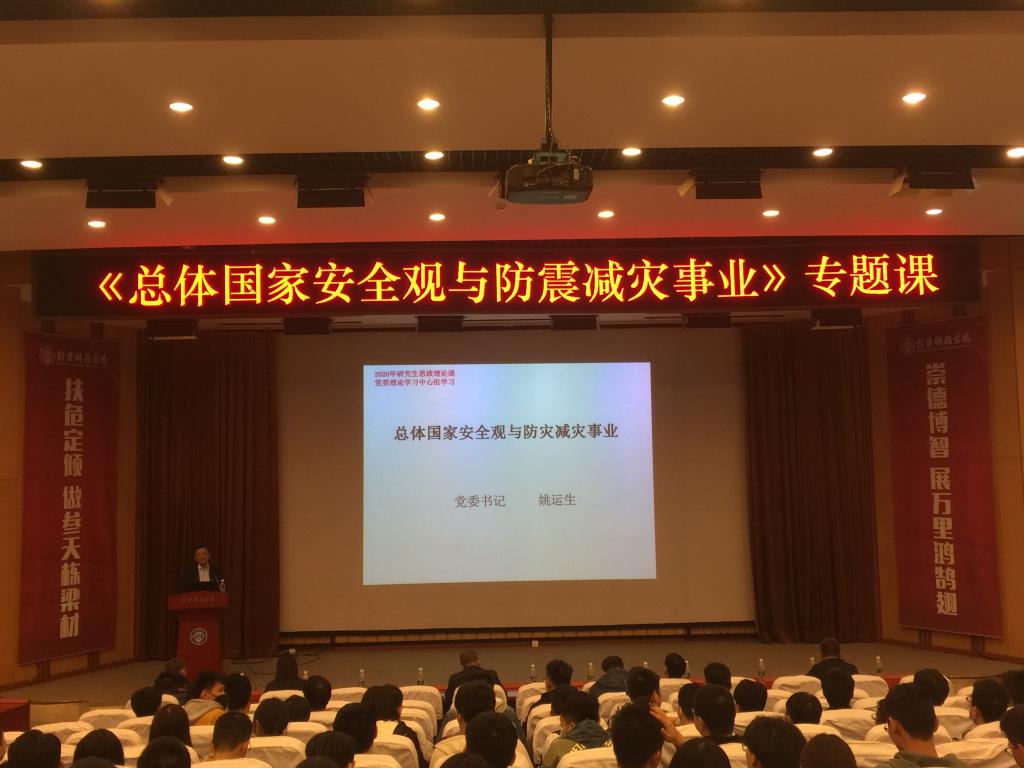 姚运生在主题为《总体国家安全观与防震减灾事业》的专题课上,重点讲述了国家安全观的历史演进、核心内容和在防灾减灾救灾领域的体现。他强调,防灾安全是社会安全的重要组成部分,防灾减灾是保障社会安全的重要行动举措;我们要深入贯彻落实习近平总书记防灾减灾救灾重要论述精神,准确把握新定位、新理念、新举措和新要求,推进学校防灾减灾救灾教育体系改革,构建“全灾种、大应急”教育体系,实现学校防灾减灾救灾教育事业现代化。