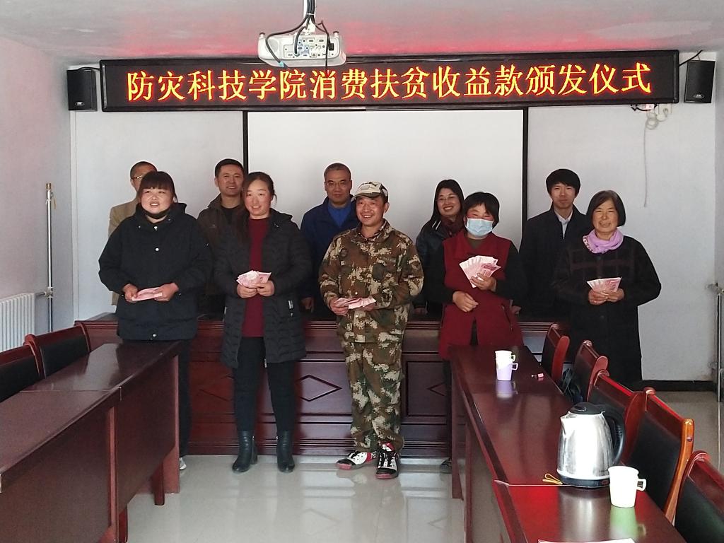 在杨树底下村村部,任云生、梁瑞莲向防灾科技学院消费扶贫的收益群众颁发了收益款,参加了经济管理学院防震减灾科普项目组的爱心捐赠仪式和河北御鹿谷旅游有限公司针织玩偶项目结款仪式。