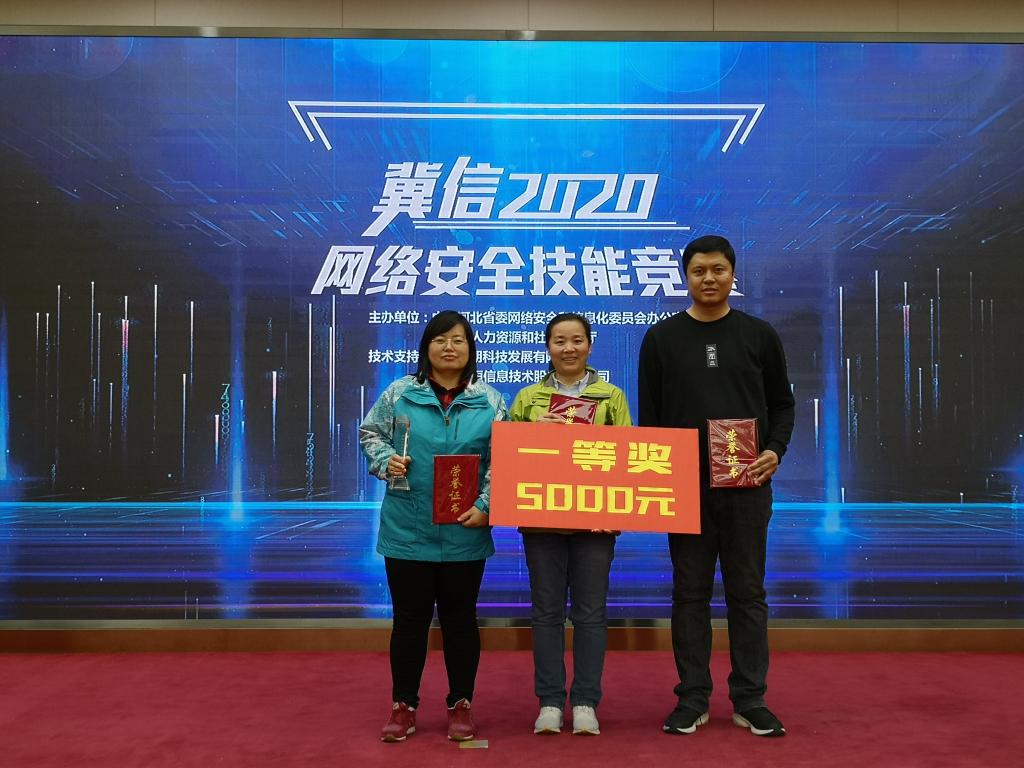 4月14日,“冀信2020”网络安全技能竞赛线下总决赛在石家庄举行,学校代表队(王小英、潘志安、冯燕茹)经过八个小时角逐,从全省60个队伍中脱颖而出取得第1名,荣获一等奖。