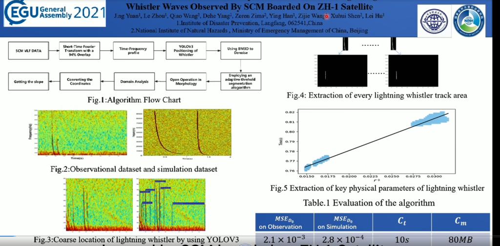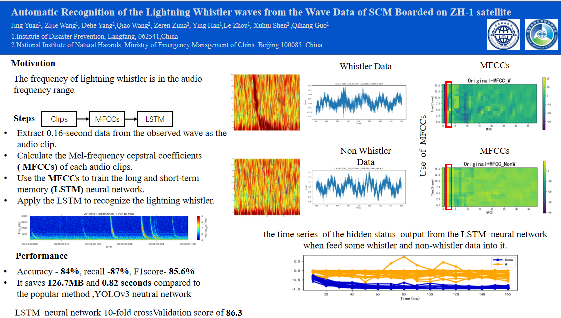 学校信息工程学院大三学生周乐在线汇报了其研究工作《Automatic Extraction of the Dispersion Coefficients of Lightning Whistler Waves Observed By SCM Boarded On ZH-1 Satellite》;王子杰同学在线汇报了其研究工作《Automatic Recognition the Lighting Whistler waves from the Wave Data of SCM Boarded on ZH-1 satellite》,该工作引起了SWARM卫星团队的关注,受到了业界的好评。指导老师分别是学校信息工程学院的袁静老师和韩莹老师以及国家自然灾害防治研究院的申旭辉、泽仁志玛、王桥和杨德贺老师等。