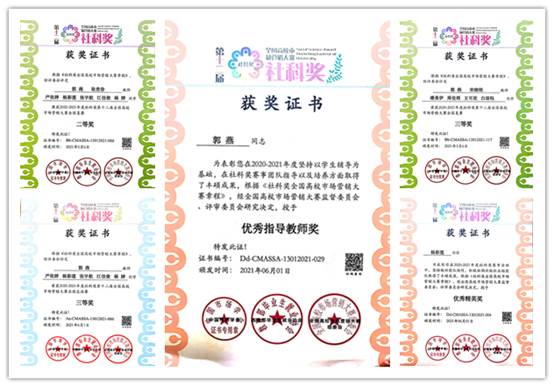 此前,我院一共5支队伍参赛,从2020年10月份开始至今共7个多月,在郭燕、耿贵珍和宋晓刚三位老师的指导下,历经理论知识笔试、校内选拔赛、全国复赛、全国总决赛四个阶段,校内选拔了3支队伍参加全国复赛,其中,由潘美伊、周佳雨、王可欣、白琼钰同学组成的好好学习团队获得“社科奖”第十二届全国高校市场营销大赛全国复赛三等奖;天韵队以全国复赛二等奖进入全国总决赛并获得“社科奖”第十二届全国高校市场营销大赛全国总决赛三等奖。