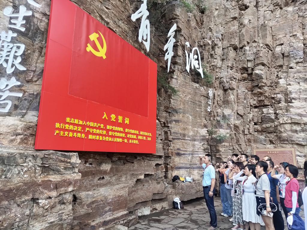 在红旗渠总干渠的咽喉工程——青年洞前,瞩目悬崖峭壁上的“人工天河”,感受到它的雄伟壮观时,大家无不为这一新中国奇迹所赞叹,无不为其中所孕育的“自力更生,艰苦创业,团结协作,无私奉献”的红旗渠精神所感染。参访党员在青年洞前,怀着激动的心情重温入党誓词。