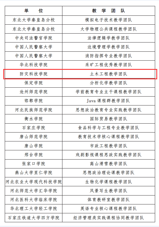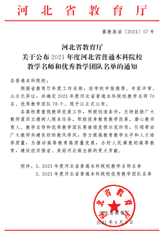 9月7日,河北省教育厅发布《关于公布2021年度河北省普通本科院校教学名师和优秀教学团队名单的通知》(冀教高函〔2021〕57号)。由我校副校长郭迅为带头人的“土木工程教学团队”获批通过。
