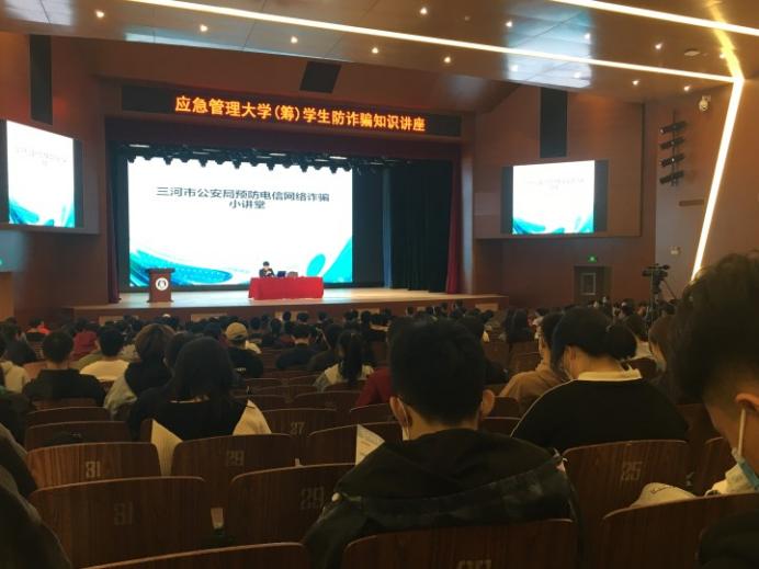 10月28日,学校特邀三河市公安局刑警大队中队长张冠武主讲防诈骗安全知识讲座。本次活动在东校区礼堂举行,各二级学院组织近千名师生参加了此次活动。