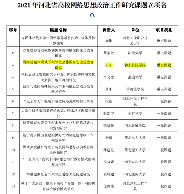 近日,河北省学校德育工作中心、河北省高校网络思政工作中心下发《关于公布2021年河北省高校网络思政工作研究课题立项名单的通知》,批准了36项课题立项。学校电子科学与控制工程学院辅导员王立申报的课题《网络新媒体视域下大学生总体国家安全观教育研究》获批为重点研究课题。
