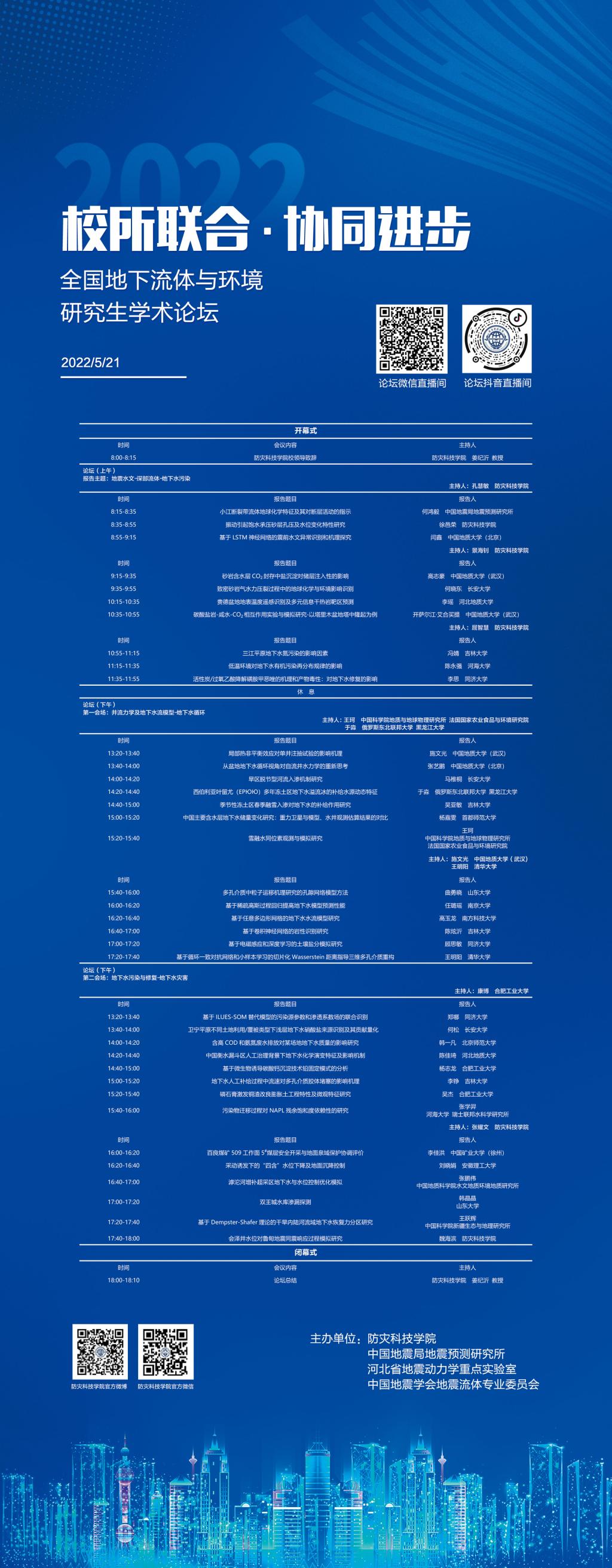5月21日,第二届“校所联合·协同进步”全国地下流体与环境研究生学术论坛隆重召开。本次论坛由防灾科技学院发起,中国地震局地震预测研究所、河北省地震动力学重点实验室、中国地震学会地震流体专业委员会联合主办。来自海内外25个高校、科研院所的百余名专家和青年学者相聚云端,碰撞思想,共襄盛会。