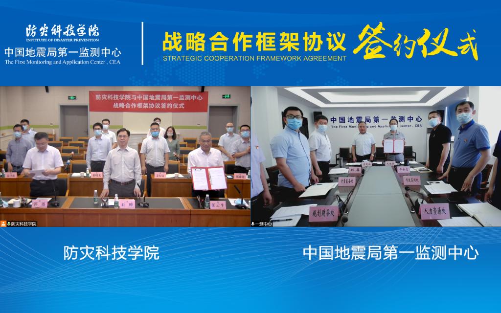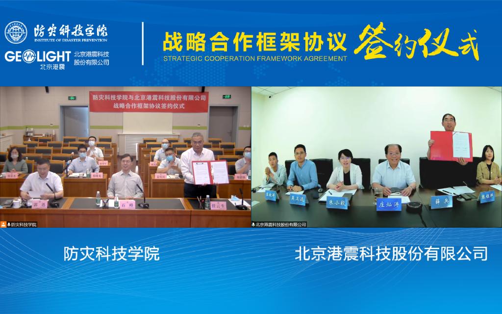 5月25日下午,应急管理大学(筹)、防灾科技学院与中国地震局第一监测中心、北京港震科技股份有限公司相聚云端,分别签署战略合作框架协议。应急管理大学(筹)临时党委副书记、防灾科技学院主持党委工作副书记石峰,应急管理大学(筹)临时党委副书记、防灾科技学院主持行政工作副校长任云生,应急管理大学(筹)临时党委委员、防灾科技学院副校长郭迅、洪利,中国地震局第一监测中心副主任宋兆山、武艳强,北京港震科技股份有限公司董事长庄灿涛、总工程师薛兵出席签约仪式。学校办公室、科研处、地球科学学院、生态环境学院、电子科学与控制工程学院负责人及相关教师,上述两家单位相关部门负责人参加了签约仪式。签约仪式由郭迅主持。