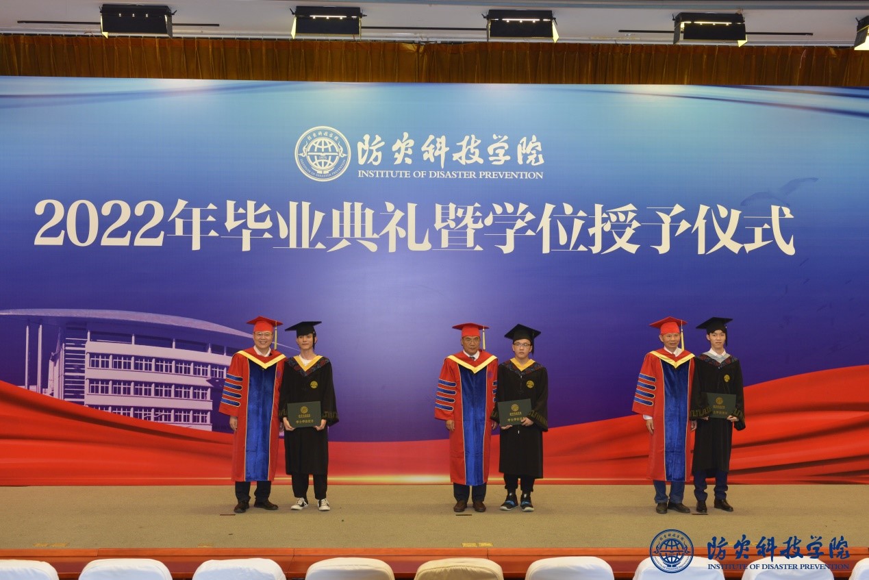 毕业典礼结束后,学校学位评定委员会主席任云生、副主席洪利、郭迅为毕业生代表正冠、拨穗,颁发学位证书,并同他们合影留念。
