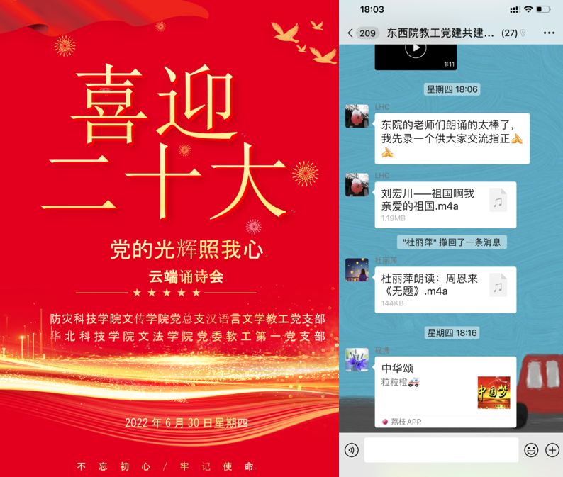 6月30日下午,为了表达两院教工党员心之所系、心之所喜,以踔厉奋进的姿态走好第一方阵、献礼党的二十大,文化与传播学院汉语言文学教工党支部和东院文法学院教工一支部联合举办了主题党日活动——以“党的光辉照我心”为主题的云端诵诗会。