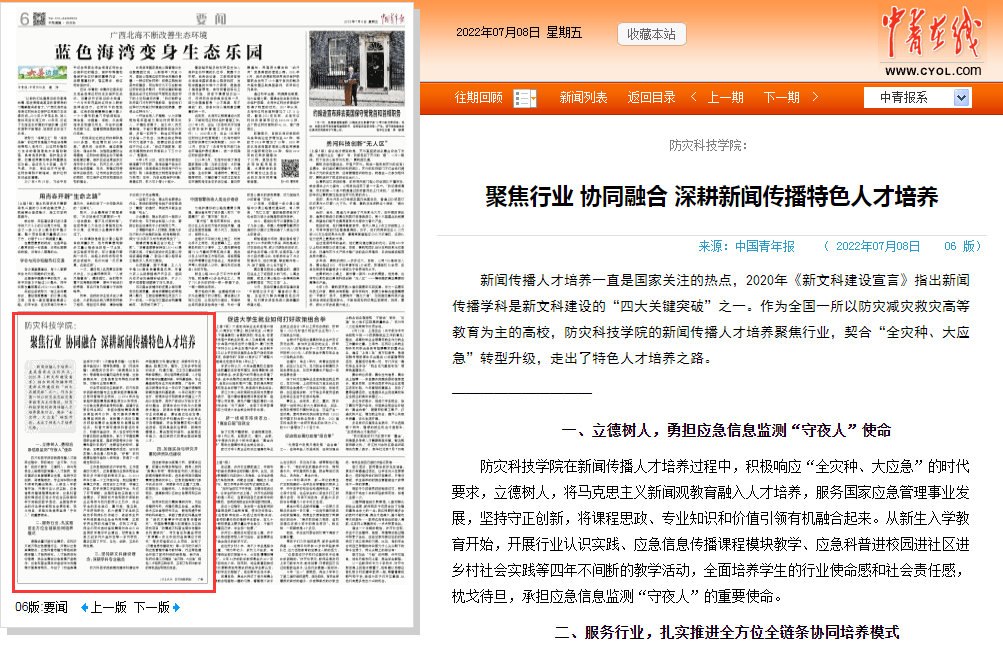 新闻传播人才培养一直是国家关注的热点,2020年《新文科建设宣言》指出新闻传播学科是新文科建设的“四大关键突破”之一。作为全国一所以防灾减灾救灾高等教育为主的高校,防灾科技学院的新闻传播人才培养聚焦行业,契合“全灾种、大应急”转型升级,走出了特色人才培养之路。