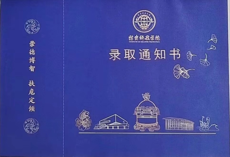 录取通知书的版式采取了左右两联的版式。外页右上方的是学校标志景观银杏叶,来源于学校秋季标志性景观——银杏大道,寓意祝贺新同学经过高中三年的勤奋努力终于将在金秋九月走进心仪的大学。外页下方一行手绘图标从左到右依次分别为:锦鲤、体育馆、张衡地动仪、图书馆、白鹅。为学校标志性建筑及校园动物,张衡地动仪在图标的中心位置,寓意防灾科技学院隶属于中国地震局,肩负防震减灾、造福人民的重要使命。锦鲤和白鹅均为学校网红动物,深受同学们喜爱,同时锦鲤也寓意着鲤跃龙门,祝贺同学们顺利升学。标志性建筑选择了图书馆和体育馆,期望同学们在大学四年的时间里,认真学习,沉淀自己;同时要热爱运动,拥有良好的体魄。