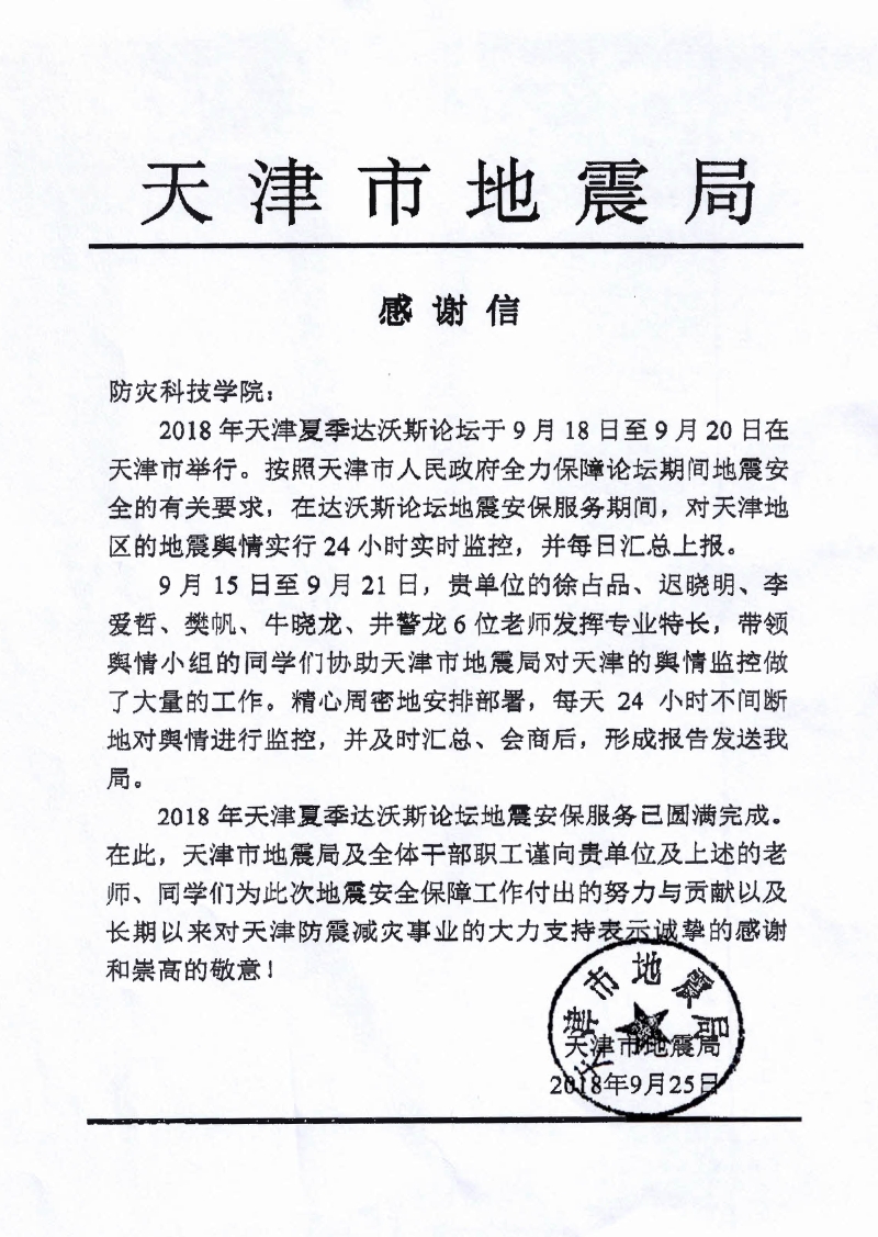 天津市地震局致信感谢学校舆情研究室