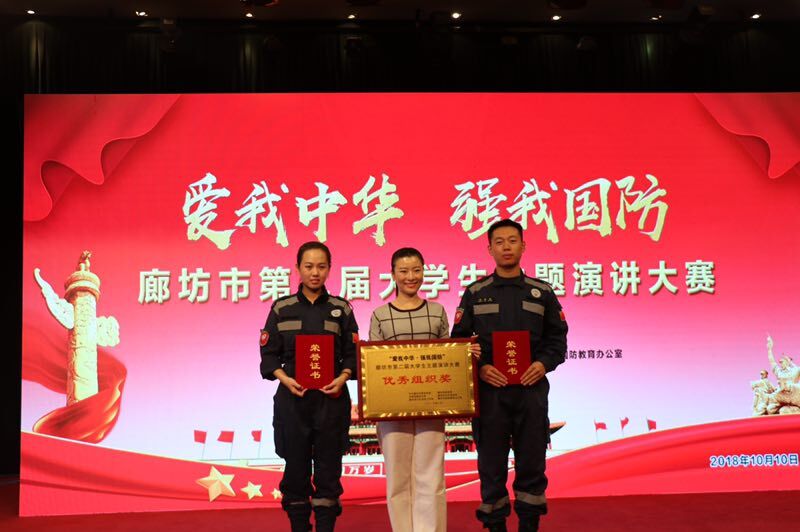 10月10日,廊坊市第二届“爱我中华·强我国防”大学生主题演讲比赛圆满落幕。我校路可音、张军强两位同学包揽一等奖,学校获得“优秀组织奖”称号。