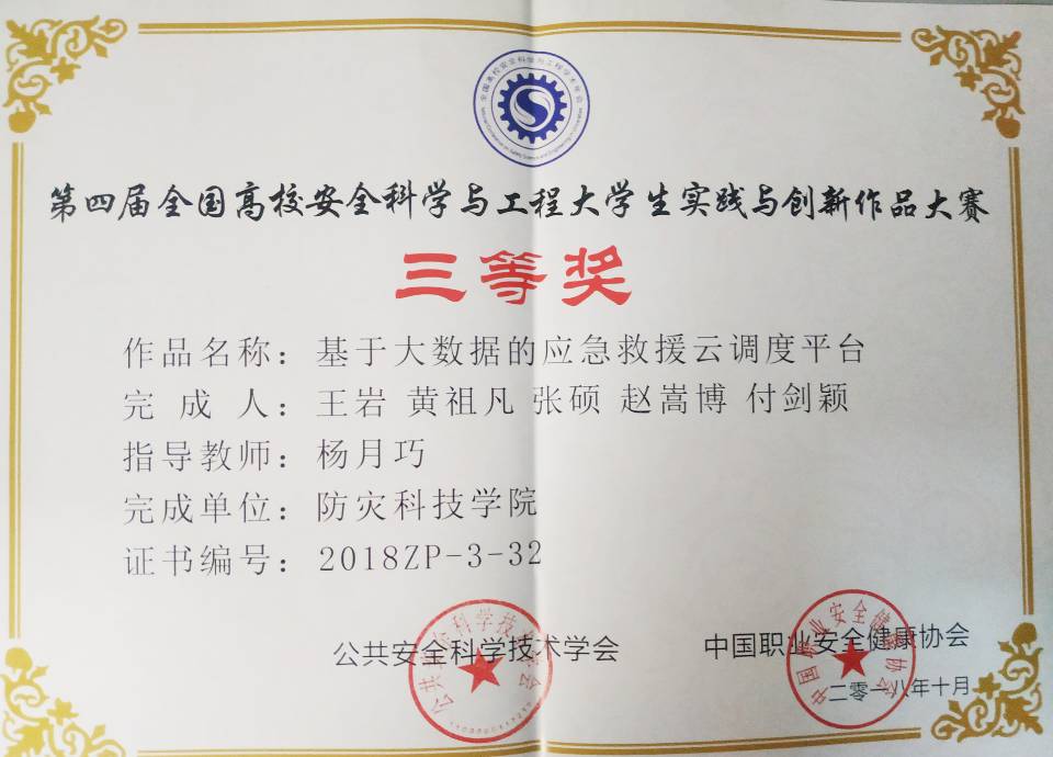 10月12日-14日,第四届全国高校安全科学与工程大学生实践创新作品大赛在安徽省合肥市举行。我校应急管理学院公共事业管理专业学生王岩团队作品《基于大数据的应急救援云调度平台》荣获三等奖。