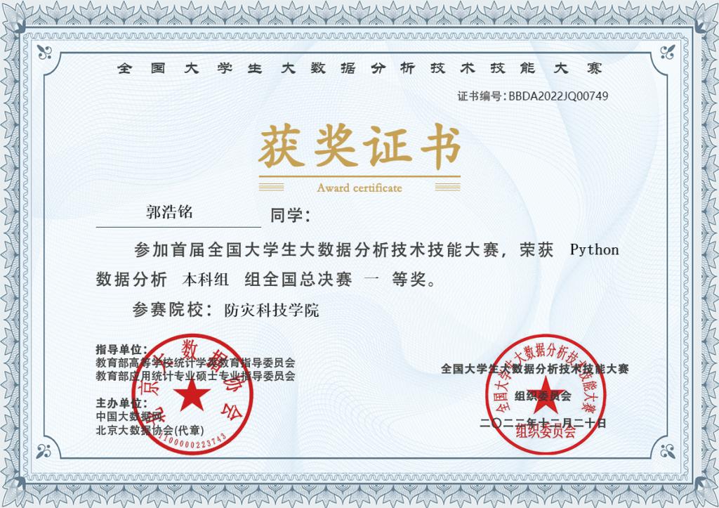 大赛组委会组织专家对全国总决赛提交的案例分析报告进行评审,最后评选出大赛各组别的总决赛获奖者共600余人次,优秀指导教师100余人,优秀组织院校40余所。全国总决赛获奖者可直接获得由北京大数据协会颁发的《初级数据分析师》证书。