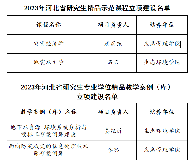 近日,河北省教育厅公布了2023年河北省研究生精品示范课程和研究生专业学位精品教学案例(库)立项建设项目名单,学校推荐的“灾害经济学”和“地震水文学”获批2023年河北省研究生精品示范课程建设项目,“地下水资源-环境系统分析与模拟工程案例库建设”和“面向防灾减灾的信息处理技术课程案例库” 获批2023年河北省研究生专业学位精品教学案例(库)建设项目。