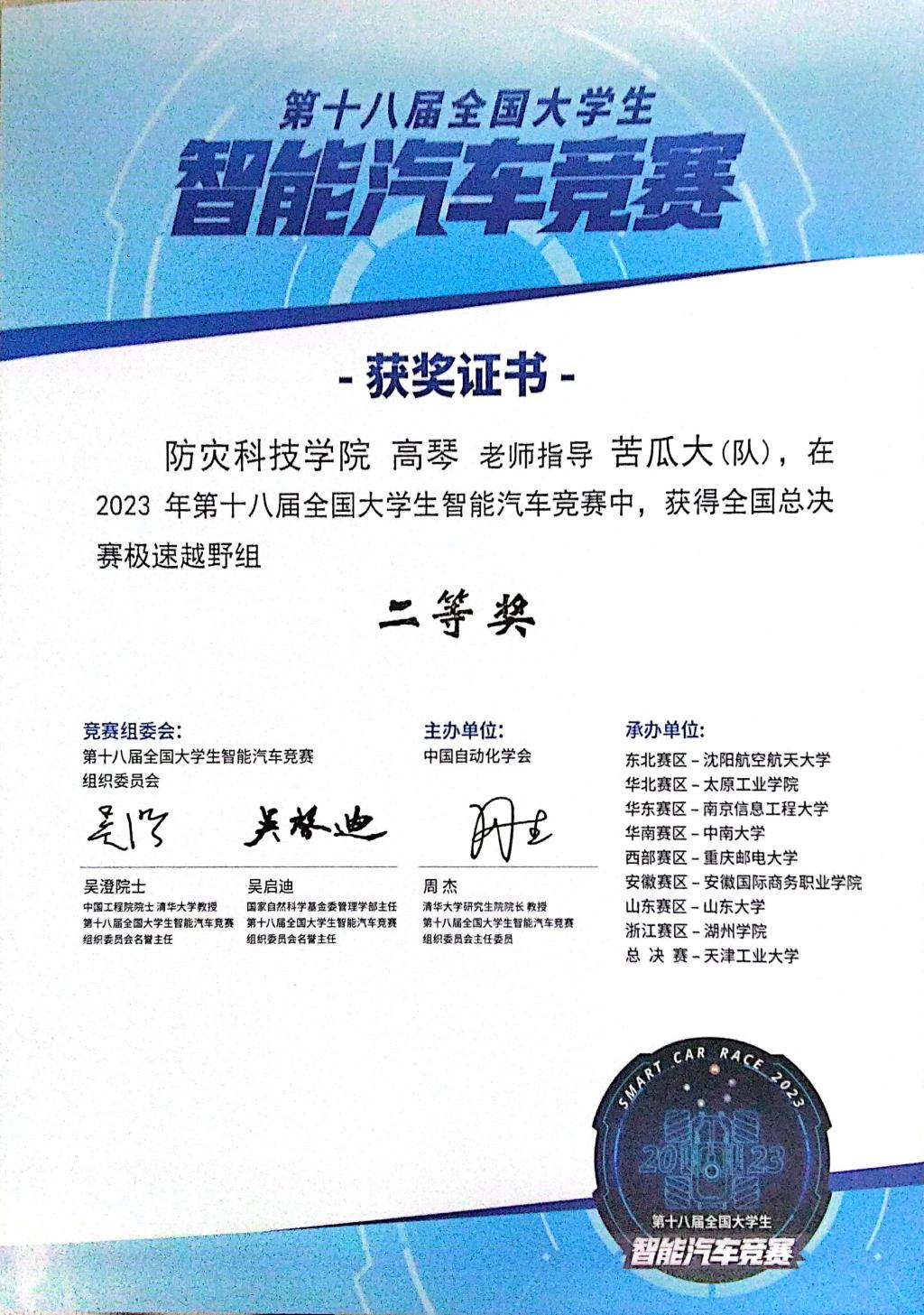 8月17日-8月20日,第18届全国大学生智能汽车竞赛全国总决赛在天津工业大学圆满举办。由学校电子科学与控制工程学院高琴老师指导,刘苑苑、黄庆成、冯伟同学组成的竞速类“极速越野组”,以华北赛区第5名的成绩进入全国总决赛,历经三天的现场环境适应、预赛和决赛层层挑战,最终进入全国20强,荣获全国二等奖。