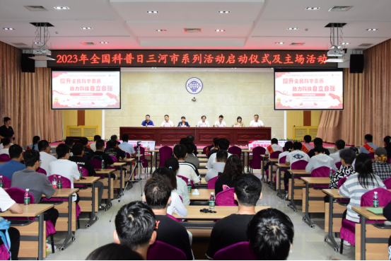 9月20日,2023年全国科普日三河市系列活动启动仪式在学校举行。联合党委常委何本华、姜纪沂,三河市科协主席、党组书记石中华,市委宣传部副部长李海英出席。三河市科技工作者、各界科技科普人员代表及学校科协委员、各二级学院师生代表等共计150余人参加活动。