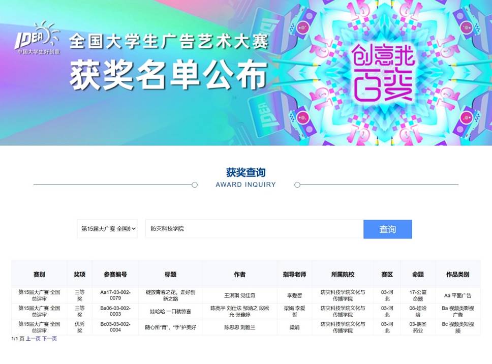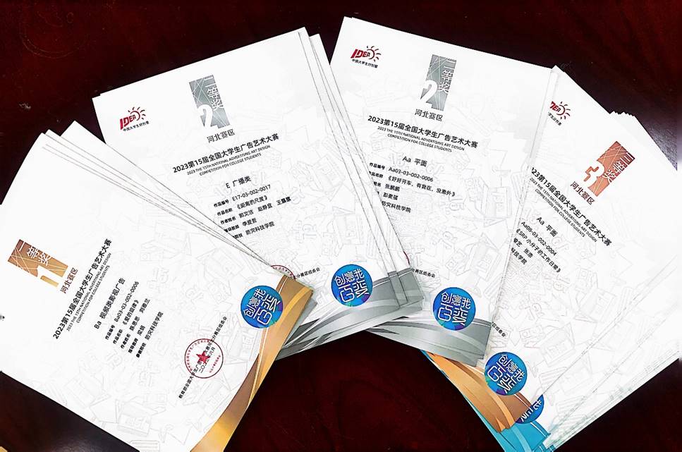 近日,第十五届全国大学生广告艺术大赛全国总评审获奖名单正式公布。文化与传播学院学生作品从全国29个赛区,包括中国传媒大学、中央美术学院、中国人民大学等1857所高校,共计提交的932848组参赛作品中脱颖而出,取得优异成绩。共荣获国家级三等奖2项、优秀奖1项;省级一等奖7项、二等奖10项、三等奖5项、优秀奖13项。彭麦福、李爱哲、梁娟、周鼎被授予大赛河北赛区优秀指导教师称号。