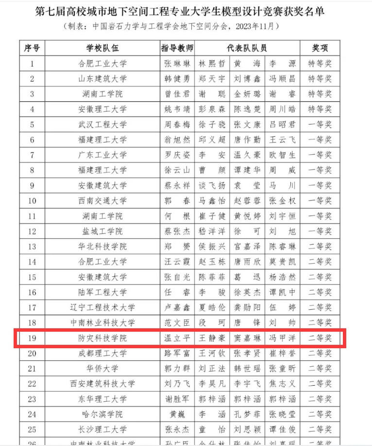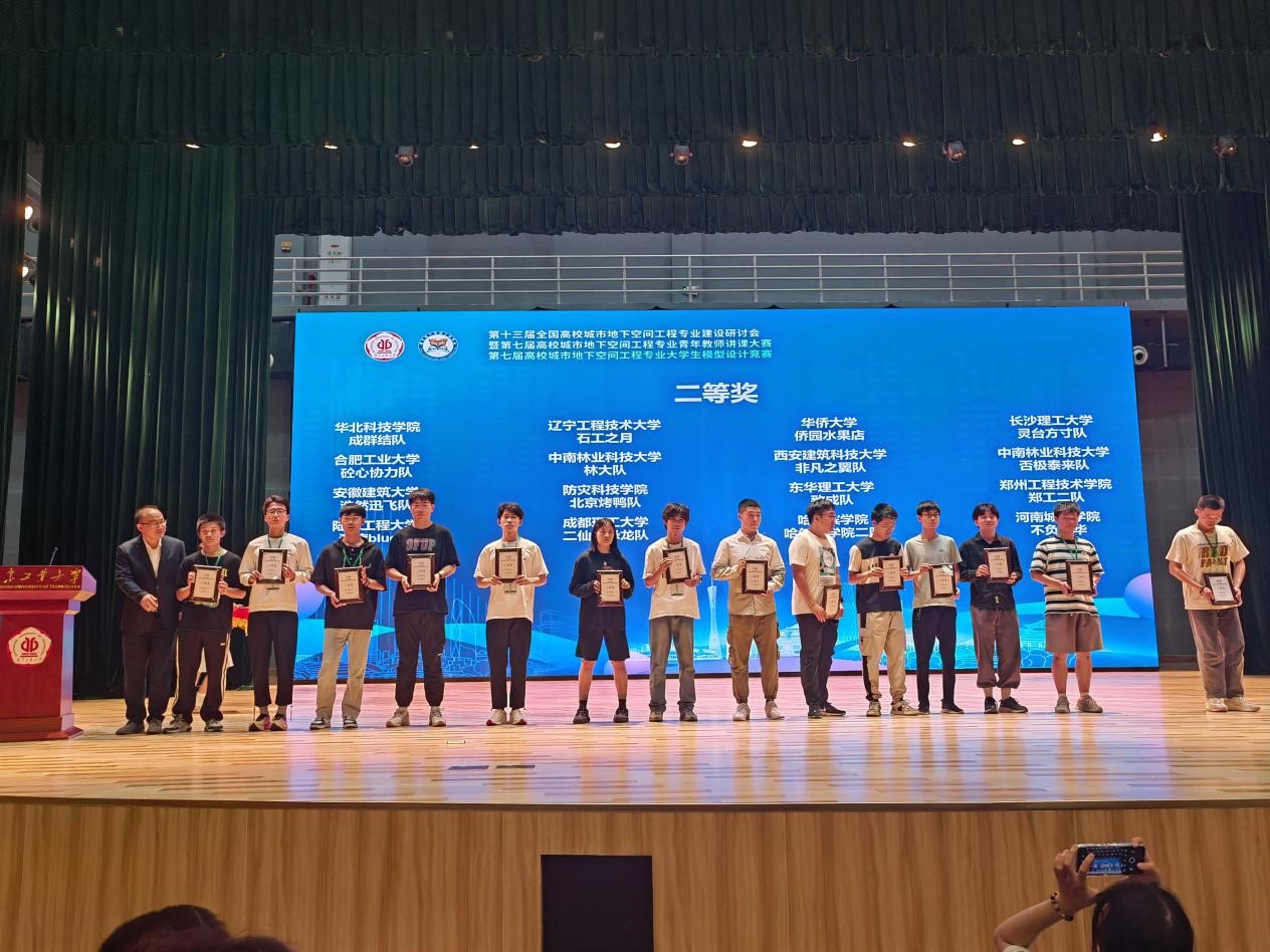 11月24-26日,由中国岩石力学与工程学会、教育部高等学校土木工程专业教学指导分委员会和广东工业大学主办,中国岩石力学与工程学会地下空间分会和广东工业大学土木与交通工程学院承办的第七届高校城市地下空间工程专业大学生模型设计竞赛公布了获奖名单,学校地质工程学院温立平老师指导的学生成员王静豪、窦嘉琳、冯甲洋组成的代表队喜获此次设计竞赛二等奖。