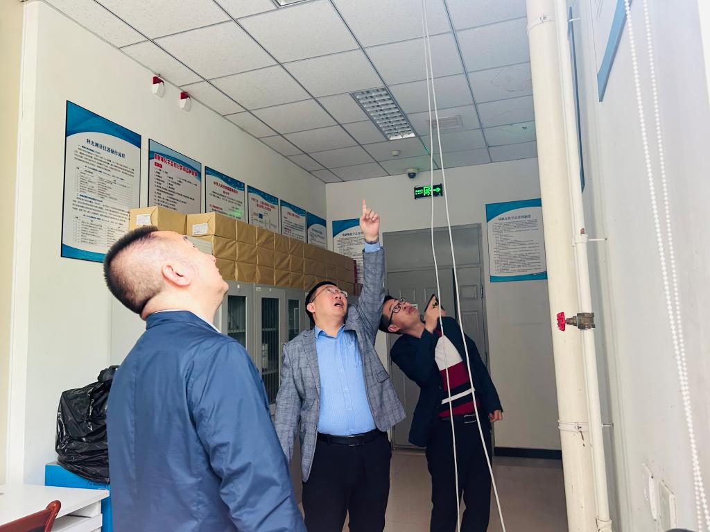 检查人员查看地球科学学院释光年实验室顶棚防水修复情况