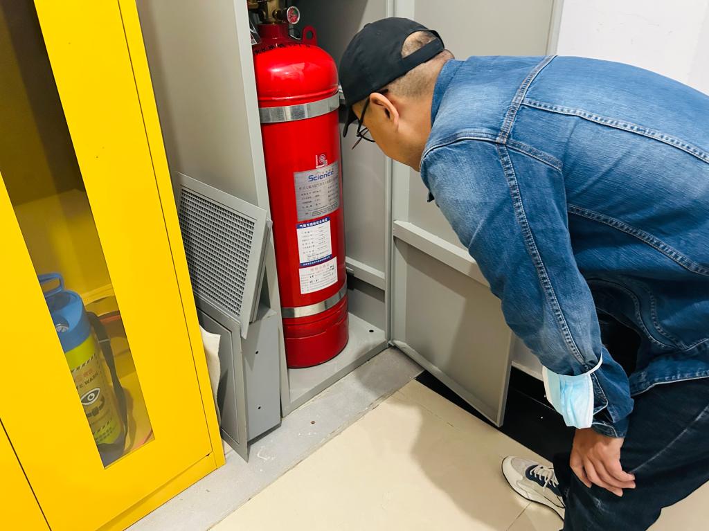 检查人员查看危化品实验室灭火器