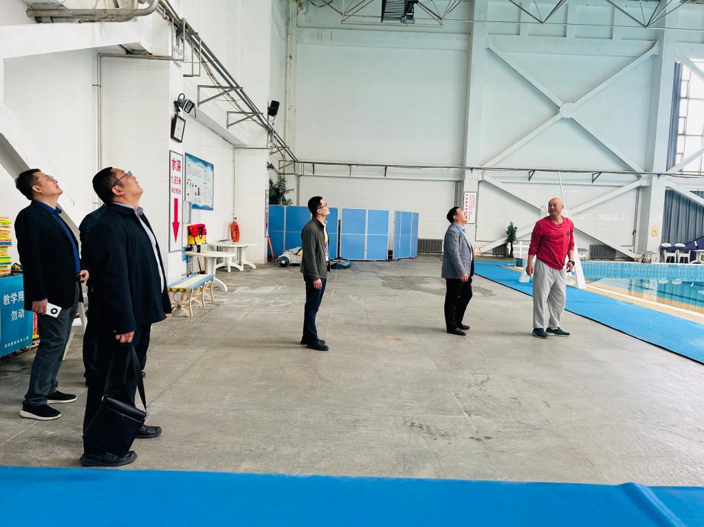 检查人员查游泳馆顶棚