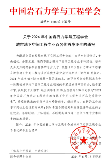 “2024年中国岩石力学与工程学会城市地下空间工程专业百名优秀毕业生”评选活动由中国岩石力学与工程学会组织,全国开设城市地下空间工程专业的东南大学、西南交通大学、郑州大学等39所高校参加。本活动极具广泛性、权威性,旨在激励全国高校城市地下空间工程专业学子刻苦学习,全面发展,以服务我国城市建设为己任,不断提高城市地下空间工程专业学生培养质量。