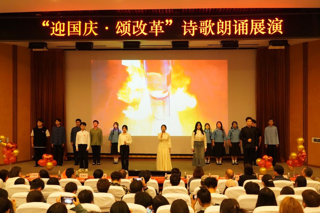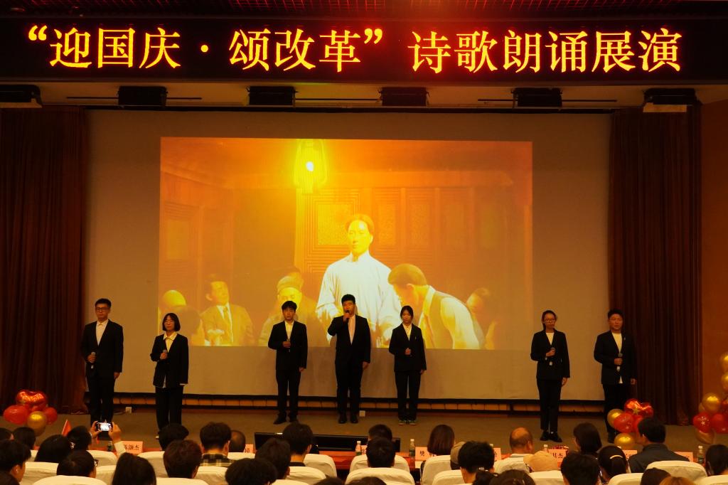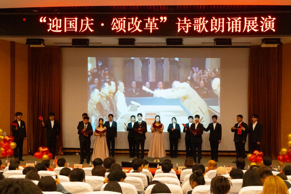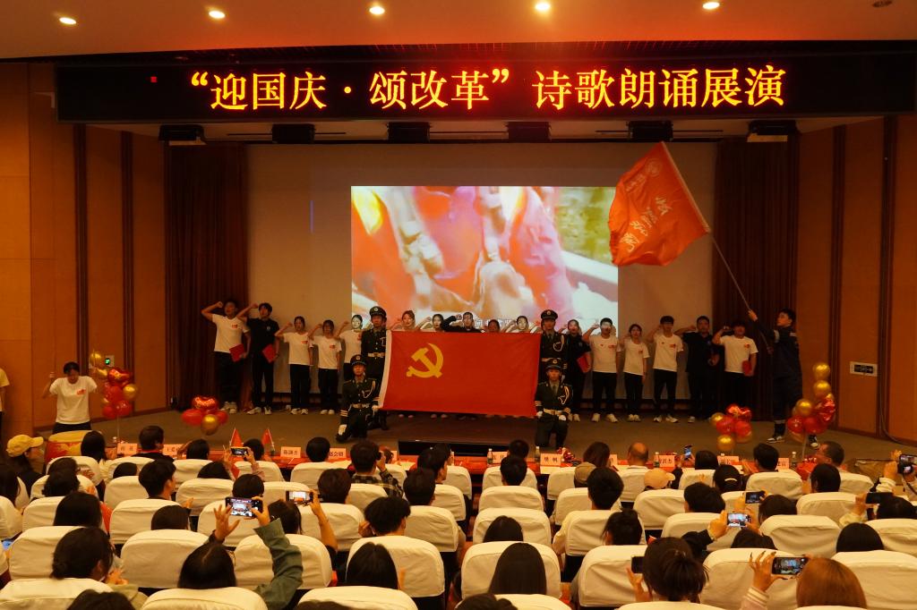为庆祝中华人民共和国成立75周年,进一步深入学习贯彻党的二十届三中全会精神,营造奋进新征程的良好氛围,9月27日,学校各二级学院党总支联合举办了“迎国庆颂改革”诗歌朗诵展演。来自10个学院的11支队伍通过诗歌朗诵、情景剧等方式向新中国75周年华诞深情献礼,用实际行动学习践行党的二十届三中全会精神。党委组织部、宣传部、学生工作部、机关党总支、团委等相关负责人莅临现场观摩指导。