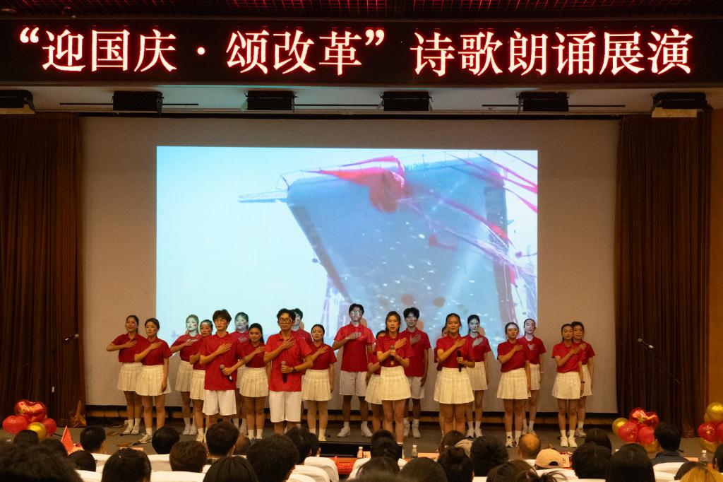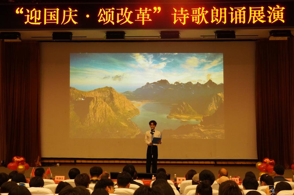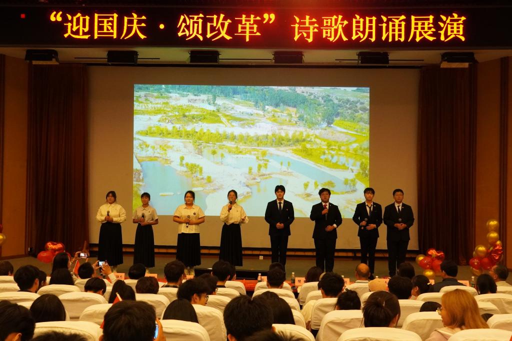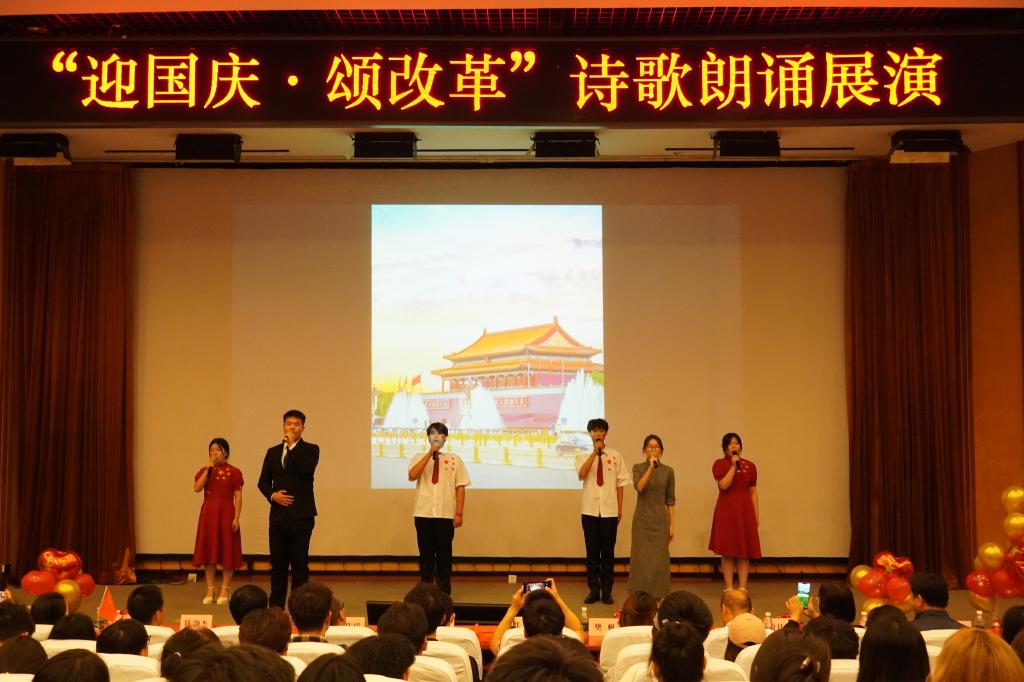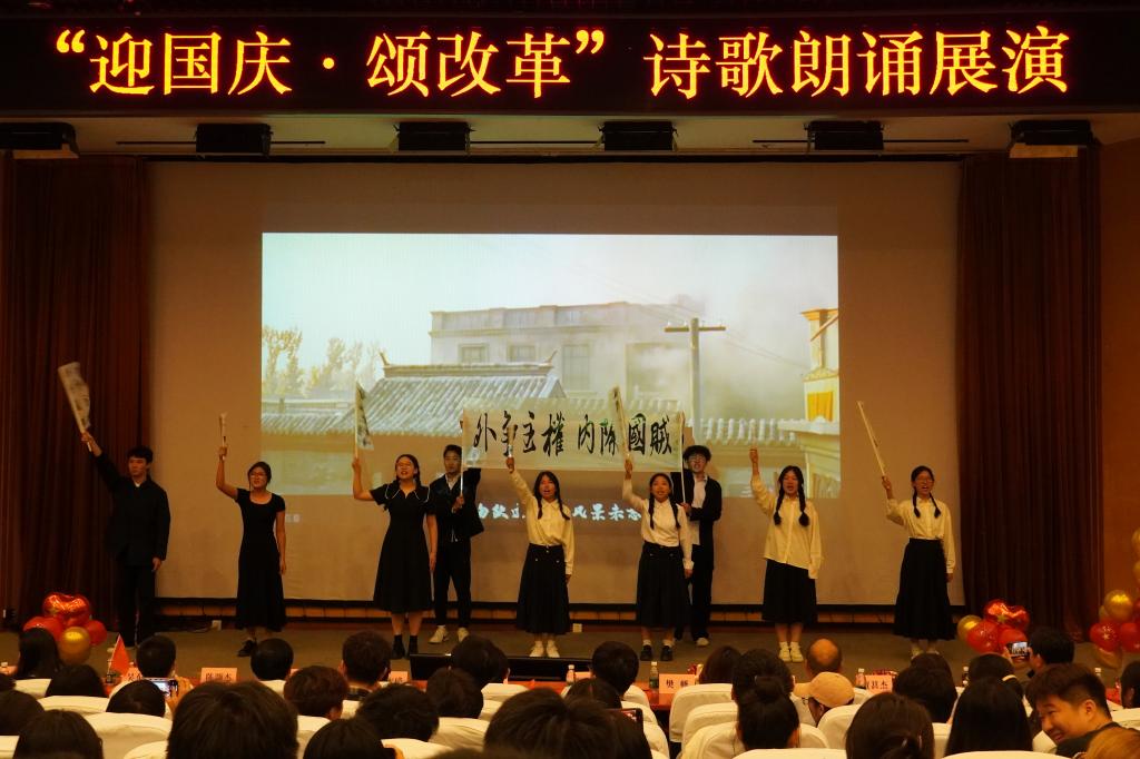 为庆祝中华人民共和国成立75周年,进一步深入学习贯彻党的二十届三中全会精神,营造奋进新征程的良好氛围,9月27日,学校各二级学院党总支联合举办了“迎国庆颂改革”诗歌朗诵展演。来自10个学院的11支队伍通过诗歌朗诵、情景剧等方式向新中国75周年华诞深情献礼,用实际行动学习践行党的二十届三中全会精神。党委组织部、宣传部、学生工作部、机关党总支、团委等相关负责人莅临现场观摩指导。