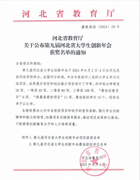 近期,第九届河北省大学生创新年会获奖名单公布并颁发证书。学校由教务处组织征集、筛选学术交流项目2项、创业推介项目2项、成果展示项目3项参加省组委会网络评审,马欢、苏占东老师带领的4个项目晋级现场展示交流,最终获得一等奖1项,二等奖2项,三等奖1项。