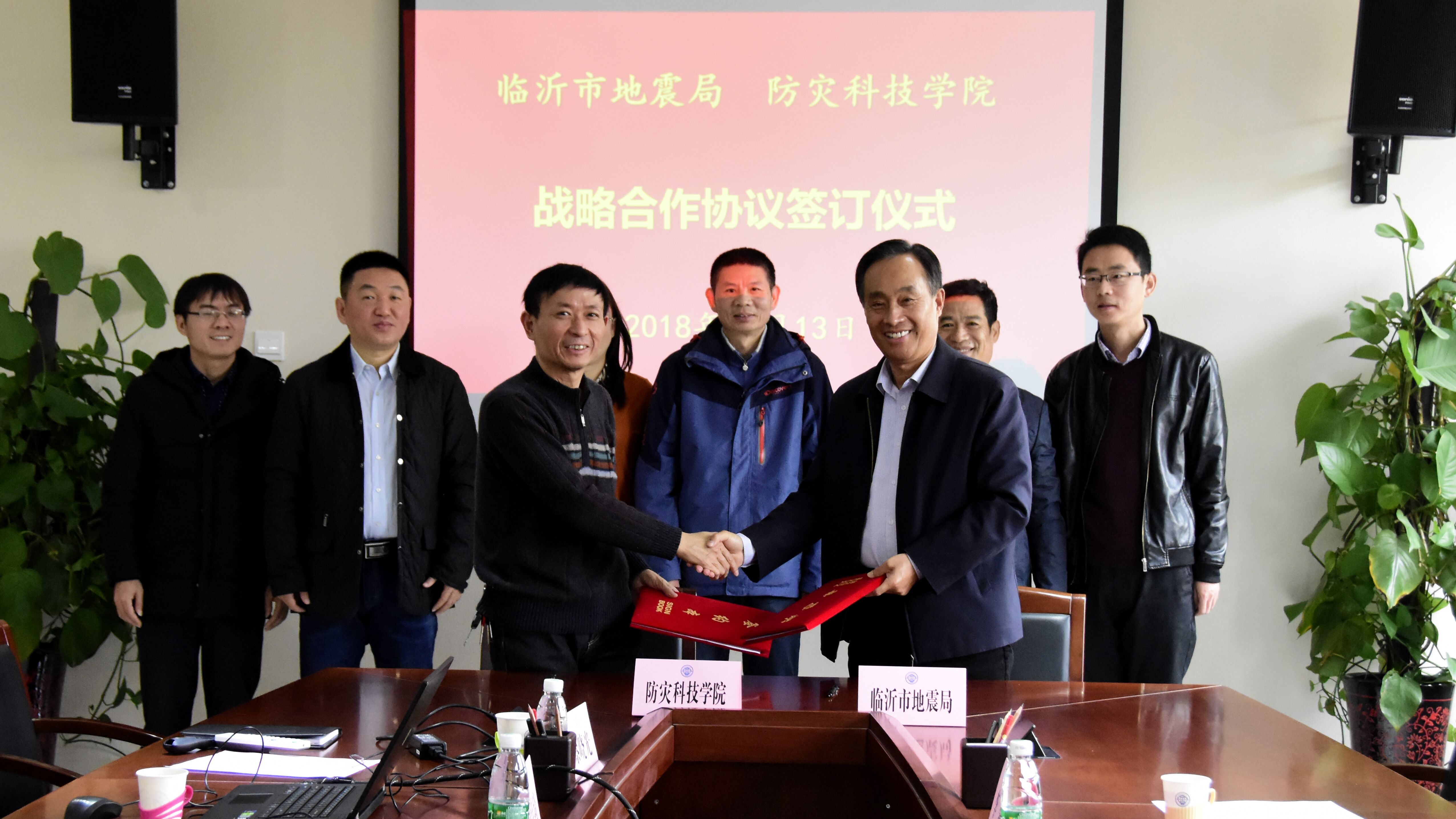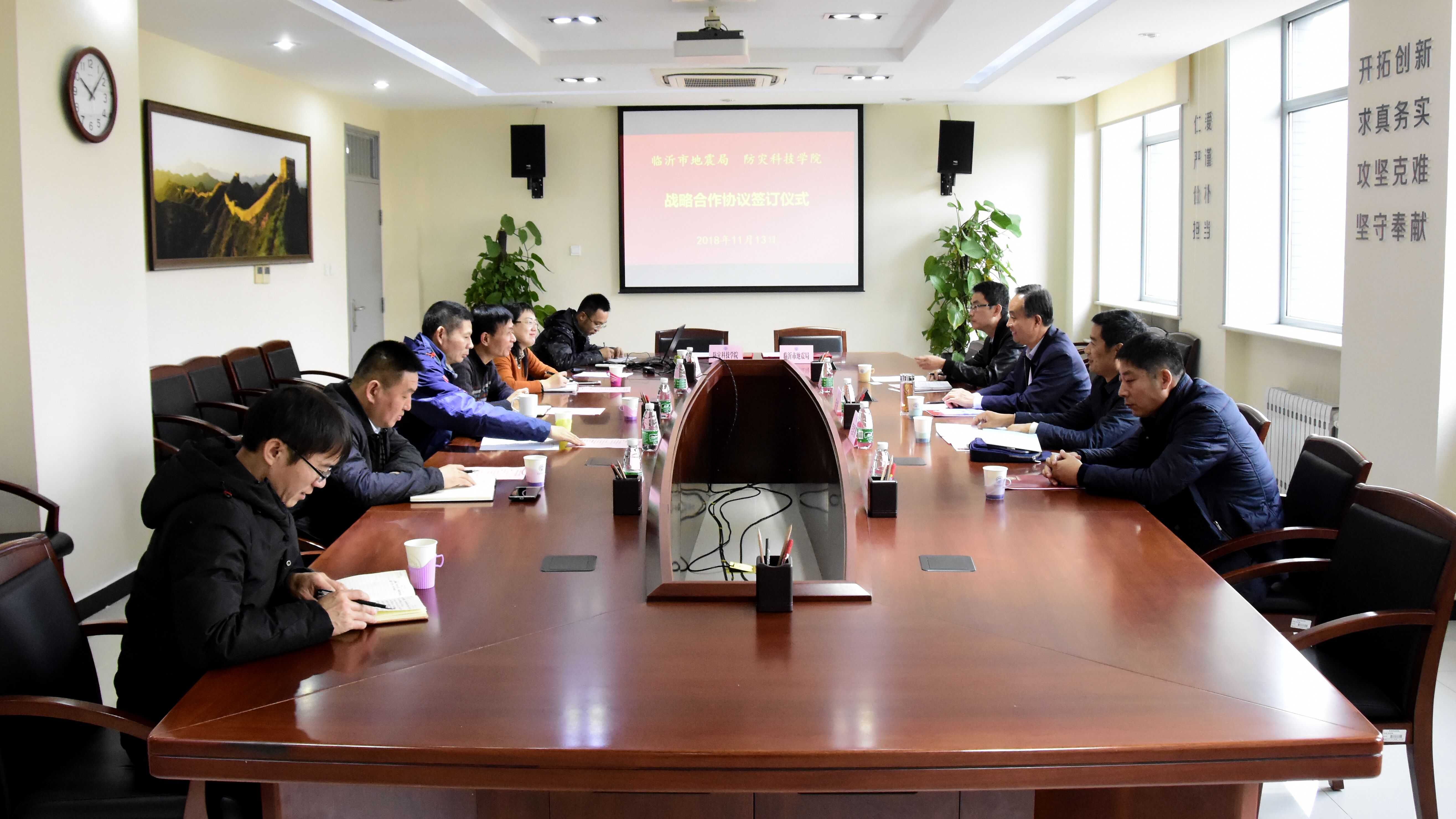 会上,刘春平从历史沿革与办学使命、建设发展的基本情况、办学成就与发展战略等方面介绍了学院的基本情况。朱士泉介绍了临沂市基本情况和防震减灾工作开展情况,希望双方从城乡建筑抗震设防、减隔震技术研发应用、决策咨询、教育资源共享、地震相关学科建设、干部人才教育培训等方面深入开展合作。随后,刘春平与朱士泉作为双方代表签署战略合作协议。