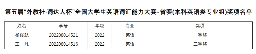 近日,第五届“外教社・词达人杯”全国大学生英语词汇能力大赛省赛获奖名单揭晓,我校学子在比赛中表现优异,获本科英语专业组一等奖1项、三等奖1项;本科非英语专业组特等奖1项、一等奖1项、二等奖10项、三等奖20项。英语B225班杨裕航、会计B232班程雨涵和秘书B221班王童语三位同学晋级国赛。