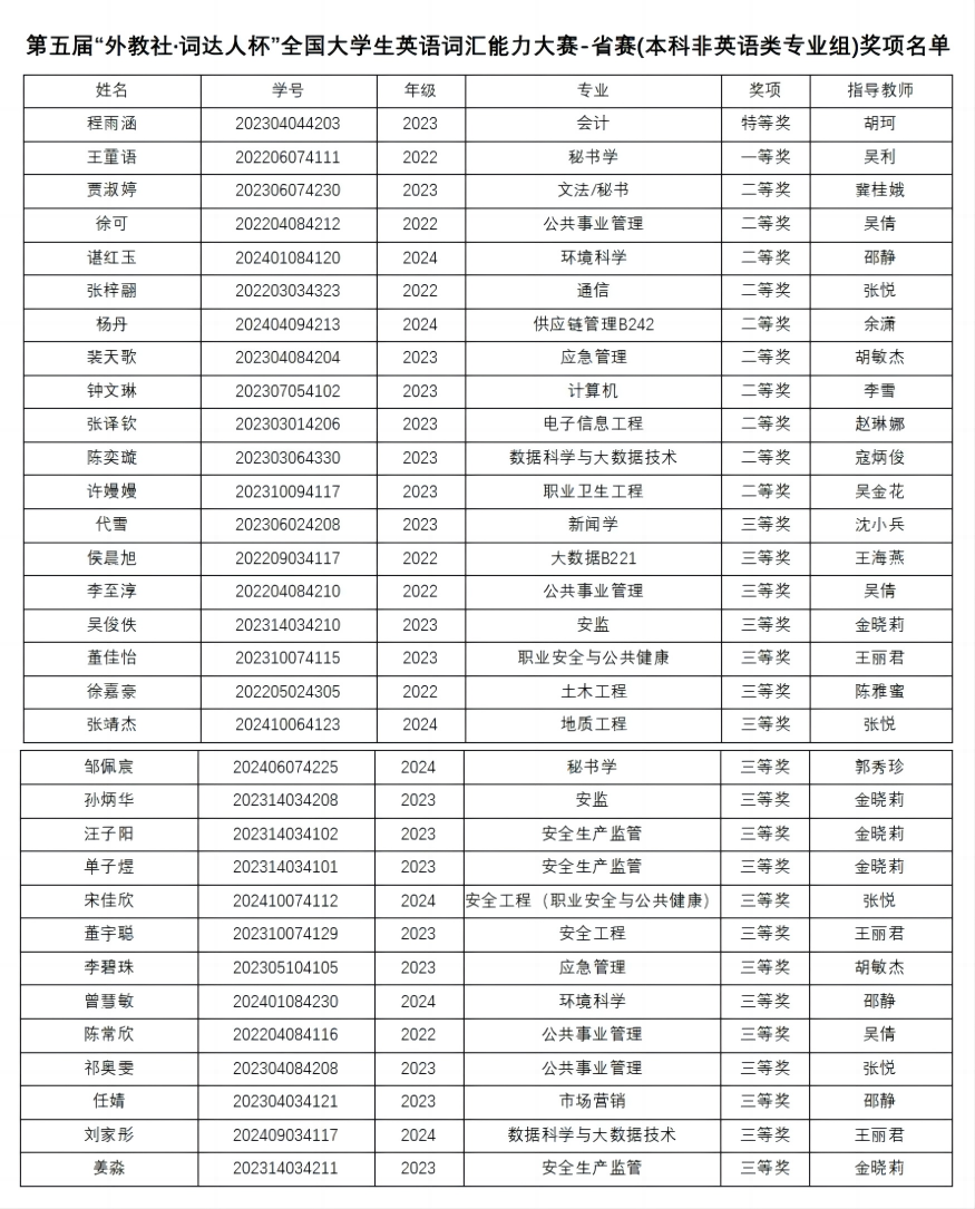 该项赛事由中国外语战略研究中心、中国外语教材与教法研究中心和上海外语教育出版社联合举办。竞赛内容涵盖高等学校英语应用能力考试A、B级词汇及课程思政相关词汇,注重词汇学习与思政教育的有机结合。本次大赛秉持“以赛促学、以智助学”宗旨,以词汇类型广泛、学习智慧便捷、学赛融合一体为特色,为学生搭建词汇学习交流的平台。外国语学院将继续优化竞赛辅导机制和指导教师团队,整合校内外资源,助力学生在更高平台上展现专业实力,为培养具有国际视野的高素质应急管理外语人才注入新动能。