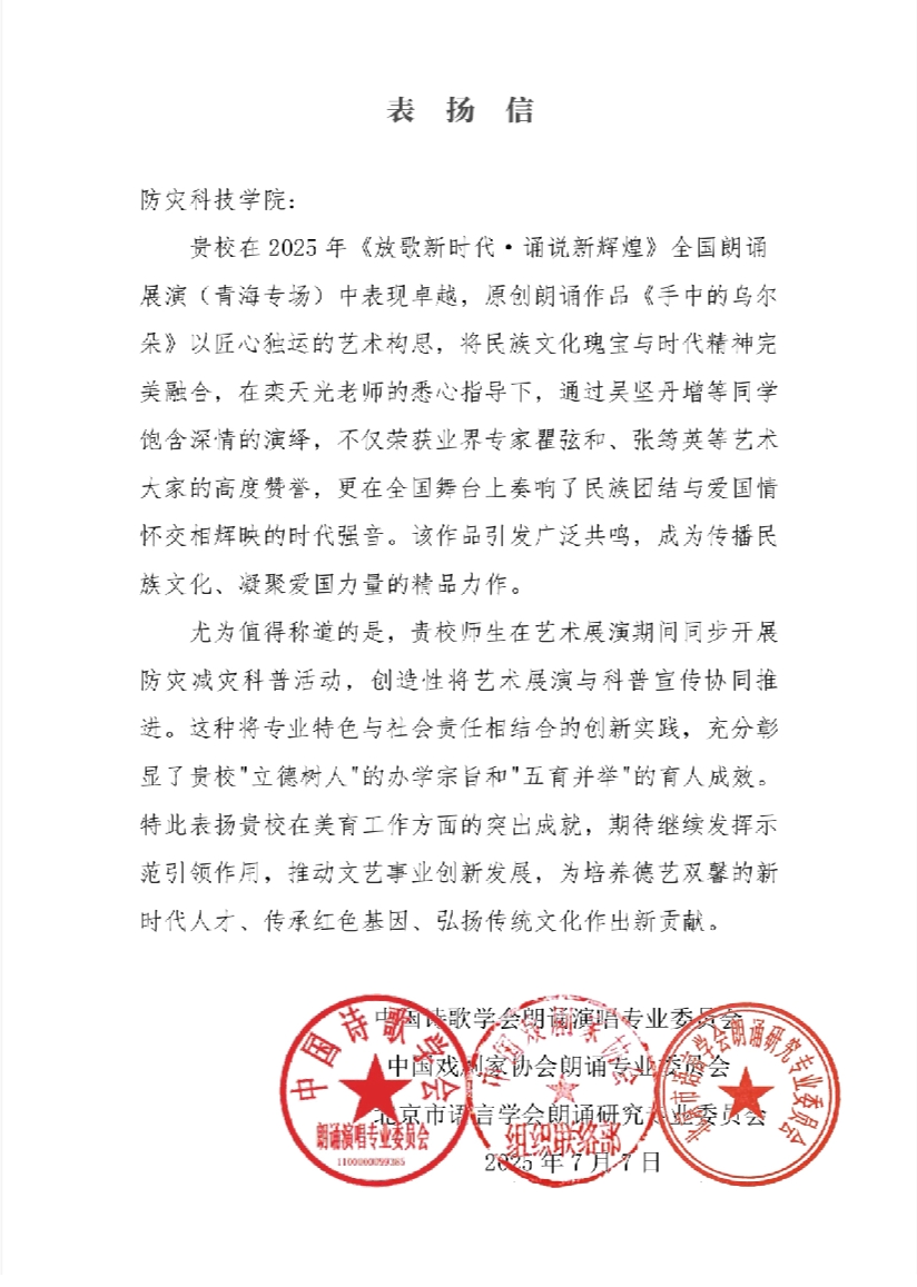 展演中,我校原创节目《手中的乌尔朵》凭借独特的艺术创新、深厚的文化底蕴和深刻的情感表达,引发观众强烈共鸣,获得瞿弦和、张筠英等艺术界权威人士的高度赞誉。展演结束后,主办方特别发来表扬信,充分肯定团队将艺术表演与防灾科普相结合的创新实践。这种专业特色与社会责任相融合的模式,生动诠释了我校"立德树人"的教育理念。