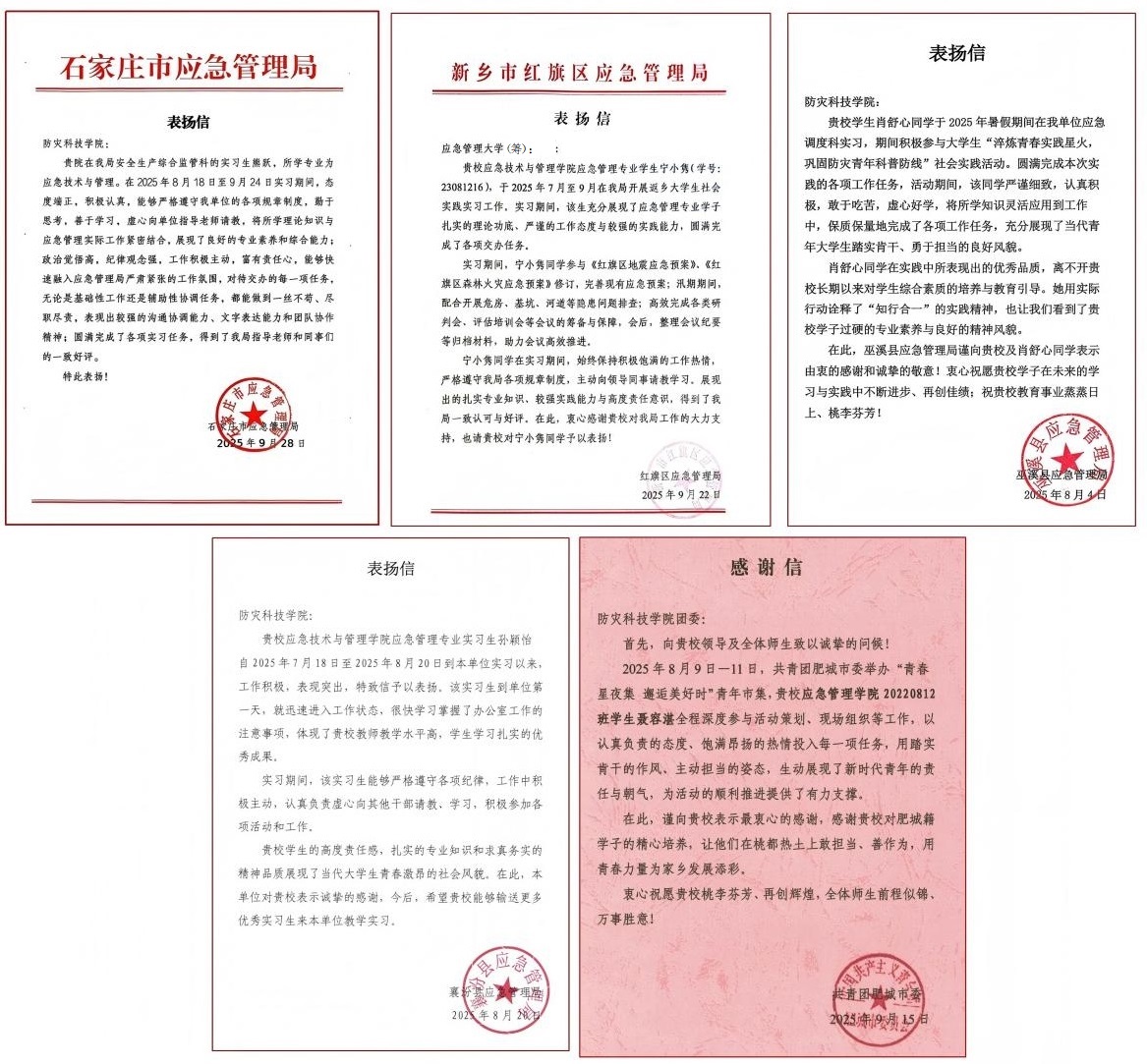近日,石家庄市应急管理局、襄汾县应急管理局、巫溪县应急管理局、新乡市红旗区应急管理局、共青团肥城市委等单位纷纷向学校发来表扬信与感谢信,对我校应急技术与管理学院应急管理等专业学生在实习实践、社会服务中的优异表现给予高度赞誉,充分肯定了学校在人才培养方面的卓越成效。