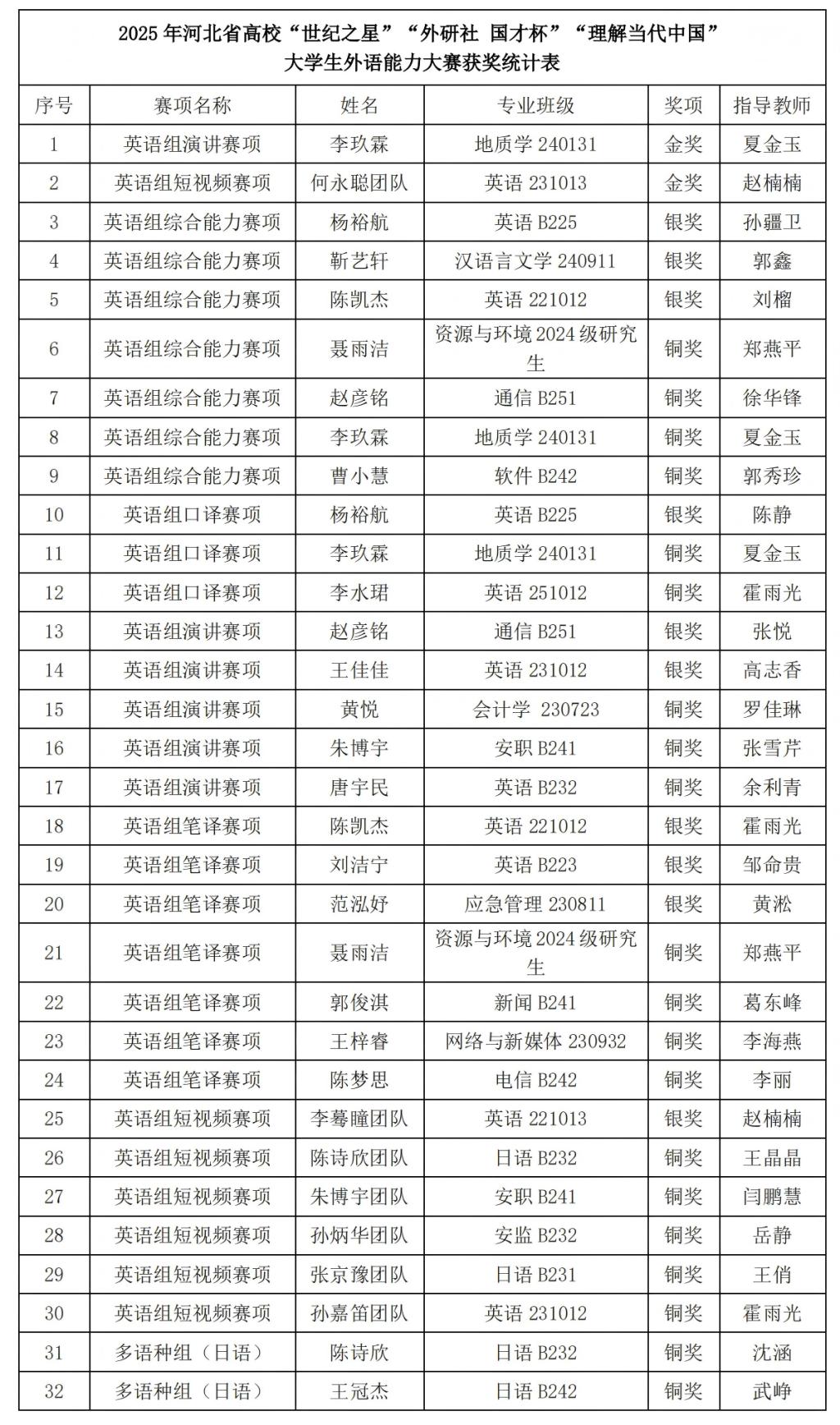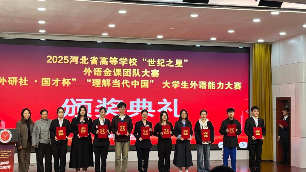 近日,2025年河北省高等学校“世纪之星”“外研社·国才杯”“理解当代中国”全国大学生外语能力大赛河北赛区系列赛事的决赛落下帷幕。我校学子表现亮眼,共斩获省级金奖2项、银奖10项、铜奖20项,其中地球科学与工程学院的李玖霖、外国语学院的何永聪团队分别摘得英语演讲、英语短视频赛项金奖,成功晋级国赛。