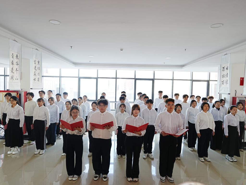 仪式上,学生代表朗诵了《梦想照亮中国》,以饱满的情感抒发了新时代青年对中华民族伟大复兴的坚定信念、对幸福生活的美好向往以及个人与国家命运紧密相连的深厚情感。随后50名学生集体朗诵习近平总书记对青年的寄语,彰显出青年学子听党话、跟党走,以奋斗姿态践行使命担当的精神面貌。