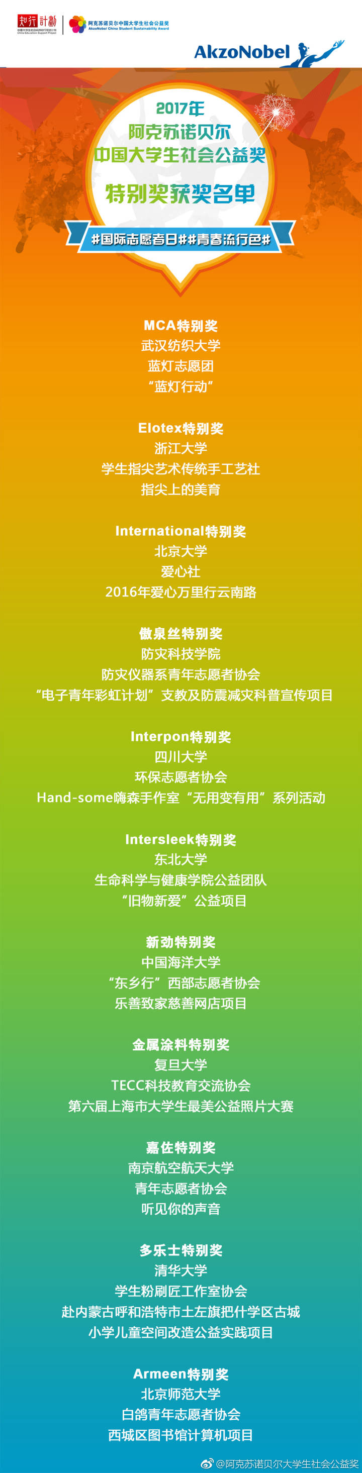 阿克苏诺贝尔中国大学生社会公益奖,是在共青团中央学校部指导下设立的中国第一个以大学生社团为奖励对象的社会公益奖项,是共青团中央学校部“中国大学生社会实践知行促进计划”的核心项目,旨在鼓励在社会公益领域有突出贡献的大学生社团,促进大学生积极参与社会公益活动。截至2017年,公益奖已吸引全国88座城市、220所高校的上千个项目申报参与,影响3500万人。
