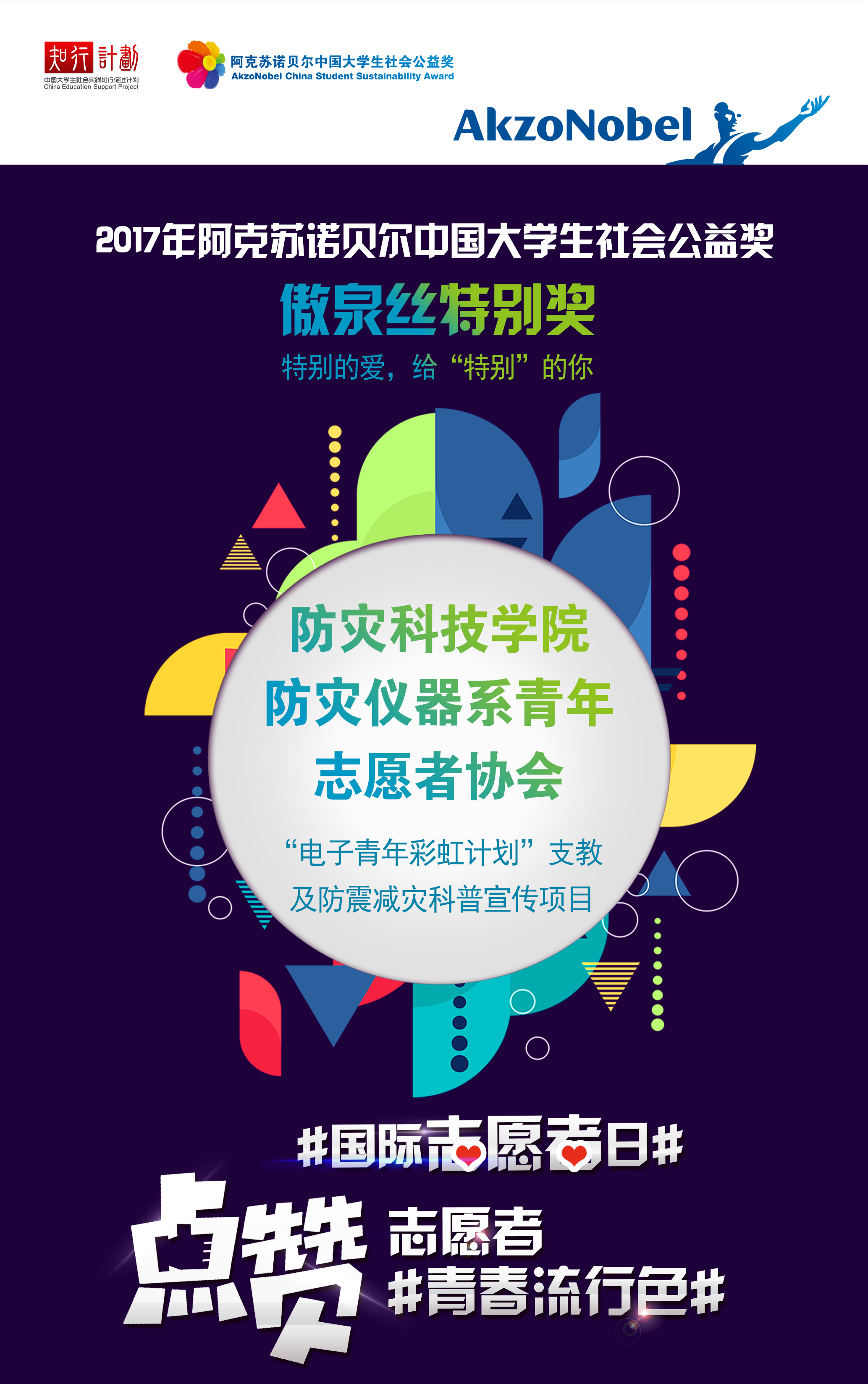 近日,防灾仪器系青年志愿者协会“电子青年彩虹计划”支教及防震减灾科普宣传项目荣获2017年阿克苏诺贝尔中国大学生社会公益奖特别奖。该项目从申请到奖项揭晓历时一年多。