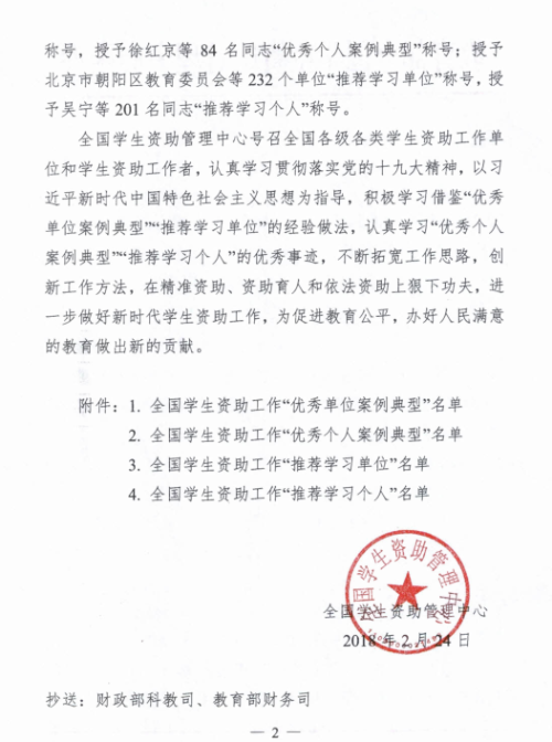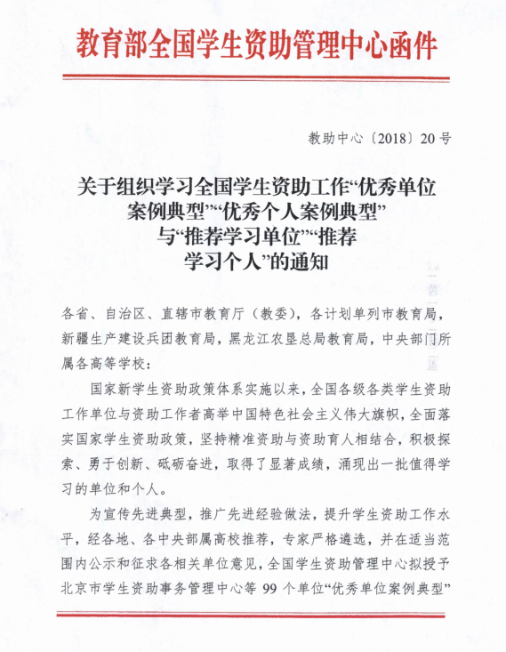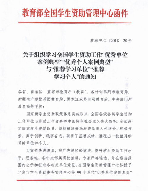 近日,教育部全国学生资助中心组织开展了2017年度全国学生资助工作“优秀单位案例典型”、“优秀个人案例典型”、“推荐学习单位”与“推荐学习个人”的评选工作,我院喜获“推荐学习单位”荣誉称号。