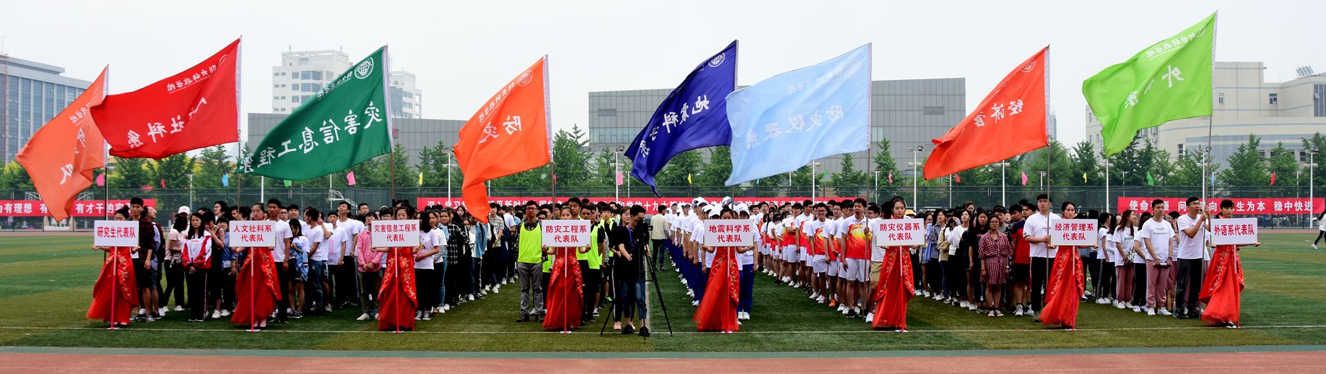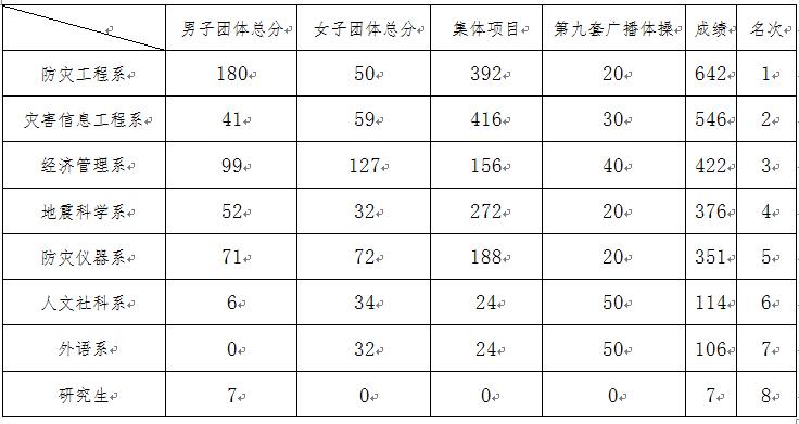 在本届运动会的各项比赛中,运动员们取得了很好的成绩,防灾工程系、防灾仪器系、经济管理系分别获得年度代表团团体总分前三名。比赛成绩如下: