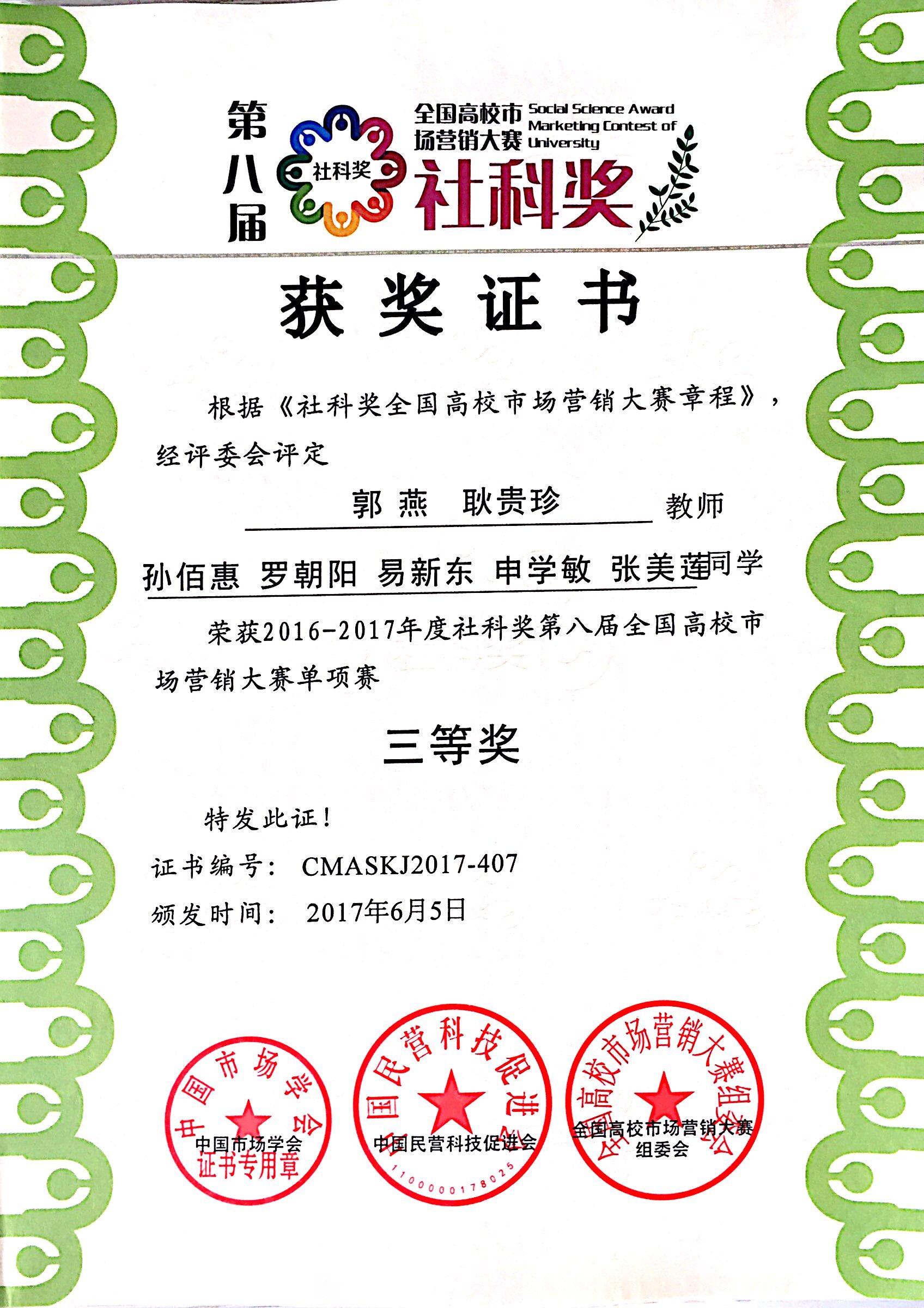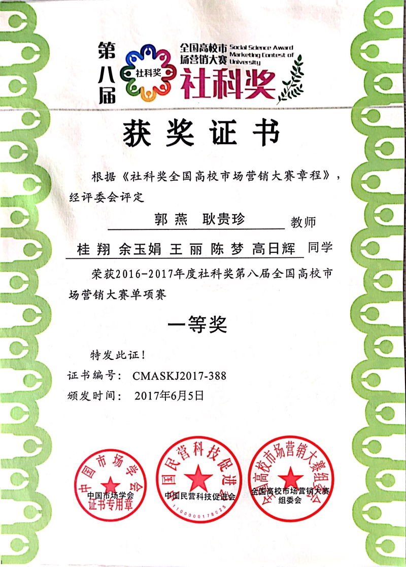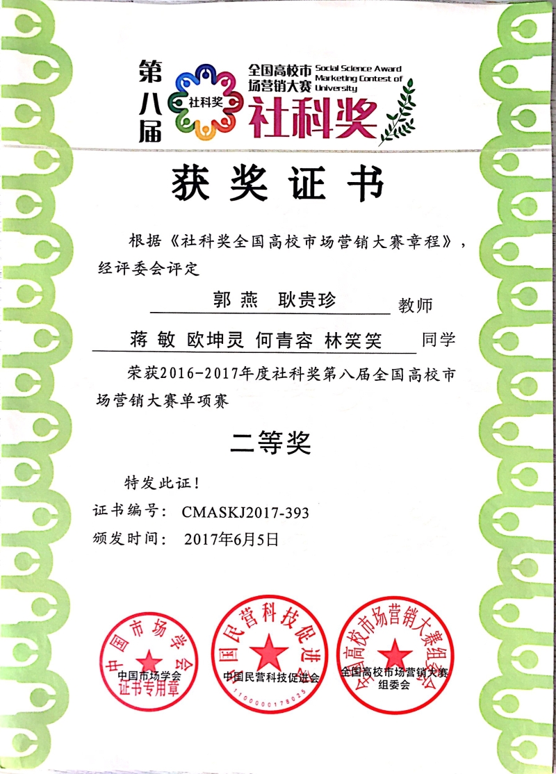 由社科院财经战略研究院指导、中国市场学会联合中国民营科技促进会共同举办的第八届“社科奖”全国高校市场营销大赛于2017年7月圆满结束,我院经济管理系工商管理专业桂翔、蒋敏、孙佰惠等同学组成的团队分别获得“第八届全国高校市场营销大赛单项奖”一等奖、二等奖、三等奖。