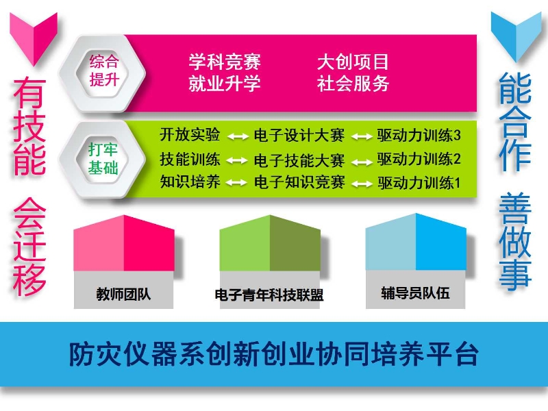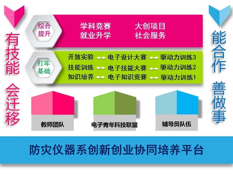 近年来,防灾仪器系在长期的工作实践中逐步完善,不断更新教学管理理念,积极探索“新工科”人才培养模式,建立健全育人机制,以“培养学生有技能、会迁移、能合作、善做事”为目标,逐步搭建起教师团队、学生社团、辅导员队伍为一体的“创新创业协同培养平台”,摸索出“以专业为背景建社团,以社团为载体办活动,以活动为抓手提能力、促学风”的第二课堂育人体系,并配合专业的驱动力训练课程,致力于培养专业能力强、综合素质优良的优秀人才,工作取得了显著成效。
