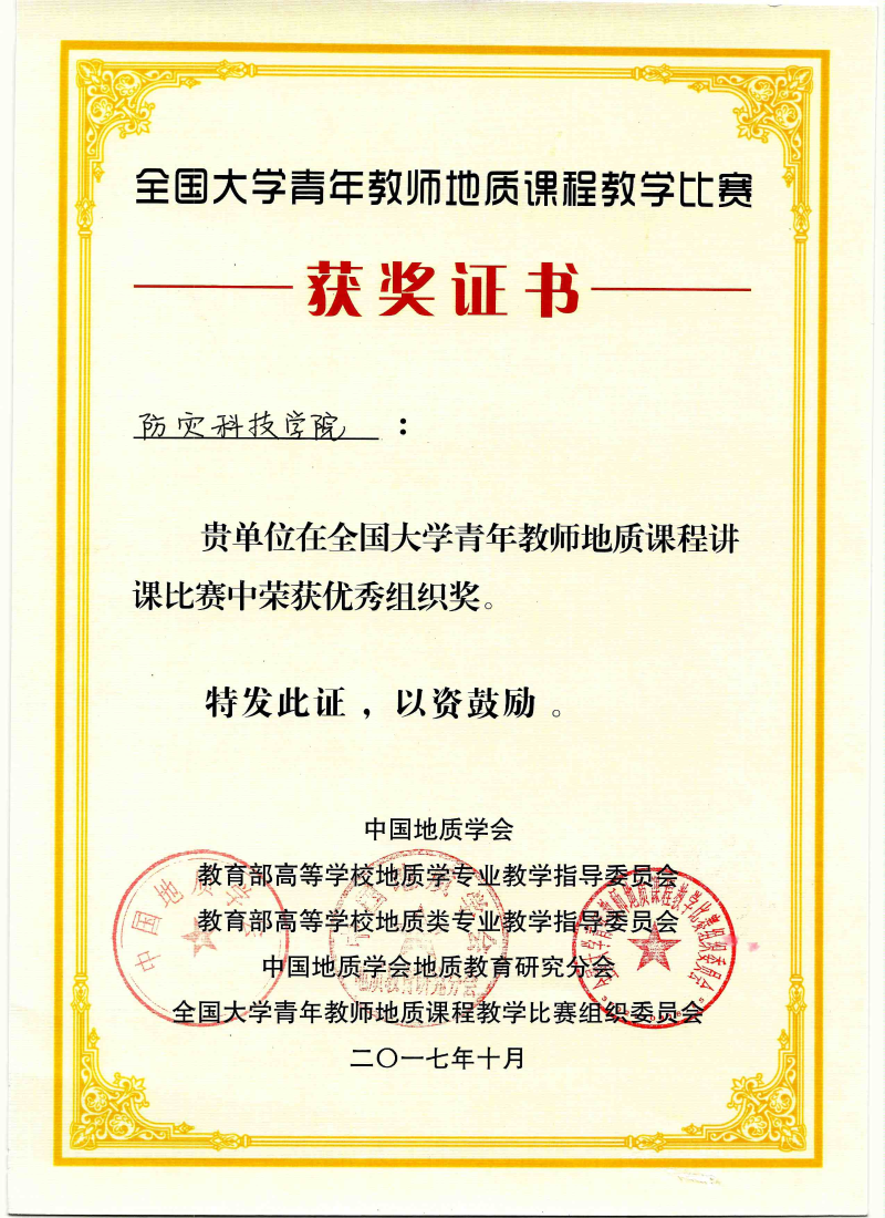地震科学系青年教师于晓辉、薛怀宇于2017年10月14日至16日在首届全国大学青年教师地质课程教学比赛中获得三等奖。同时,学院被中国地质学会授予“首届全国大学青年教师地质课程教学比赛优秀组织奖”。本次比赛由中国地质学会地质教育研究分会、教育部高等学校地质学专业教学指导委员会、教育部高校地质类专业教学指导委员会举办,比赛在山东科技大学举行。